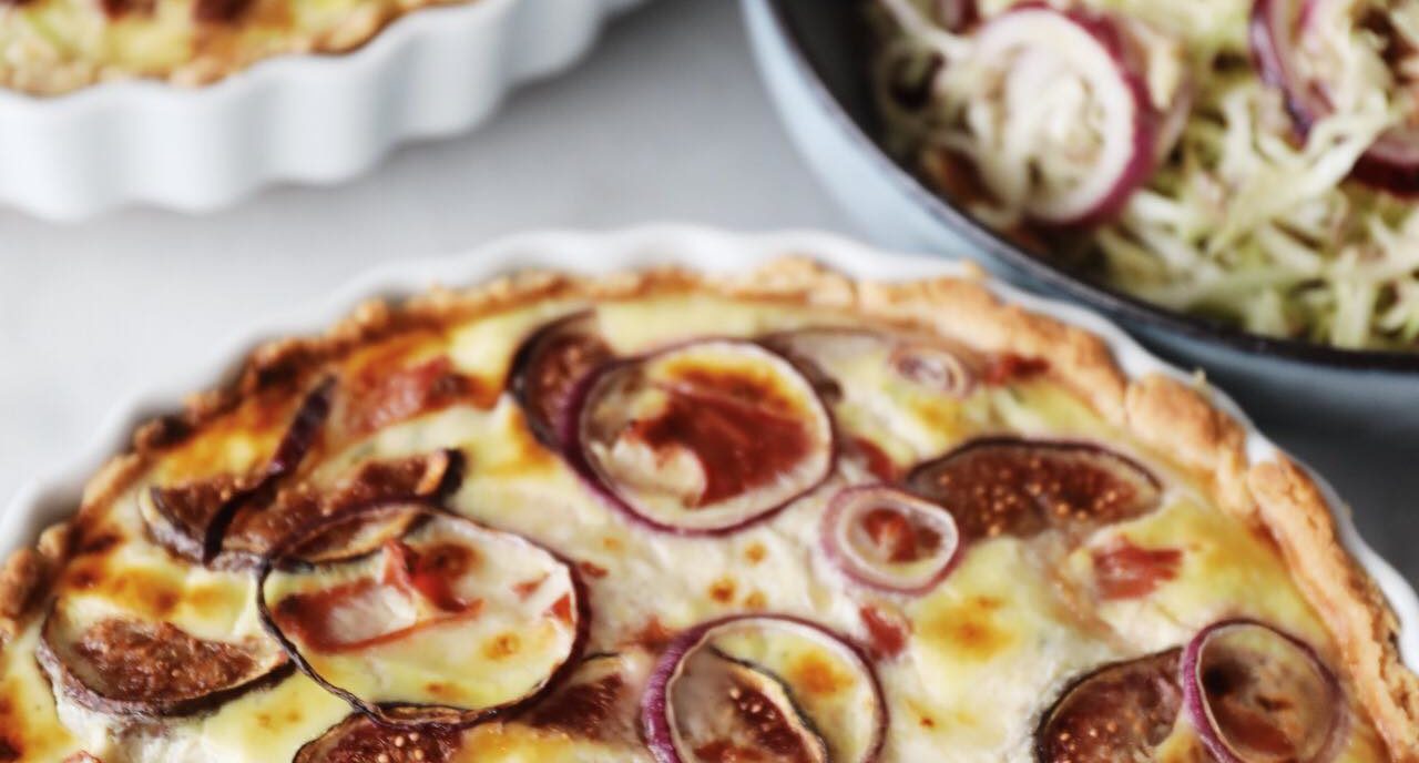 Tærten med figner er der frisk timian, figner, rødløg, parmaskinke og frisk mozzarella i. Du kan f.eks. erstatte mozzarella med gedeost, hvis du er til det. Porretærten består af porre, revet ost og bacon (massere af bacon). Begge tærter kan fryses ned, så har du nem mad, til de dage, hvor det skal gå lidt hurtigt. Hvis det skal gå endnu hurtigere, kan en færdiglavet dej også sagtens bruges.