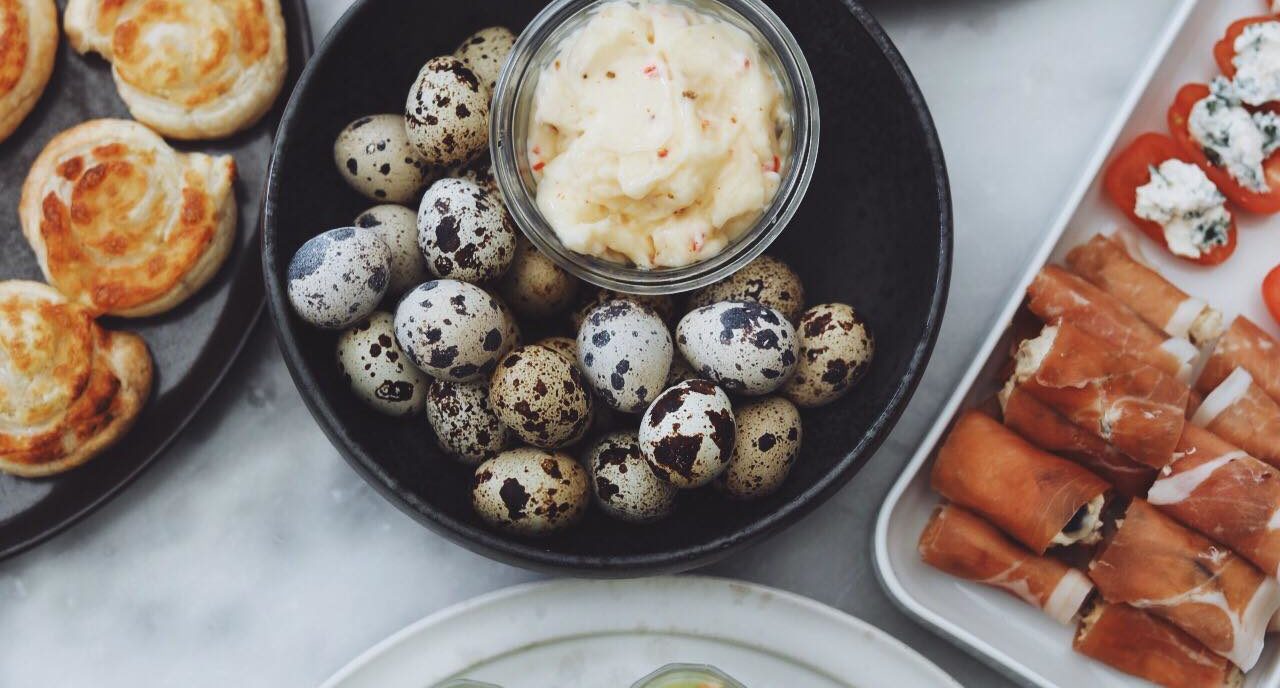 Her har jeg lavet avocadoshots med agurk og hvidløg, tomater med fetafyld, mini toast med dild og laks, parmaskinke-ruller med flødeost og dadler, butterdejssnegle og nuttede små vagtelæg med chilimayo. Hvis du synes, at 6 kanapeer til nytårstalen er lige i overkanten, så kan du nøjes med et par af dem og så servere lidt nødder, chips, dip og måske nogle grøntsagsstave til.