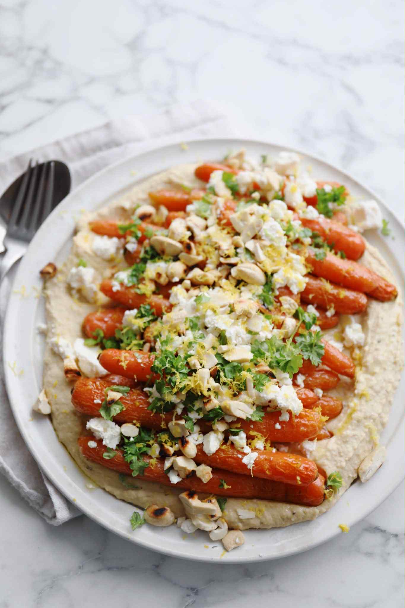 Bagte gulerødder på hummus – Opskrift på nemt og lækkert tilbehør til aftensmaden med bagte gulerødder serveret på cremet hummus med feta, cashewnødder, citron og persille. Denne vegetariske side dish er så god og meget nem at lave. Den består af en cremet hjemmelavet hummes, som smøres ud på et fad eller en tallerken, hvor den toppes med bagte gulerødder med honning. Det pyntes med smuldret feta, hakket persille, hakkede og ristede cashewnødder og fintrevet citronskal.