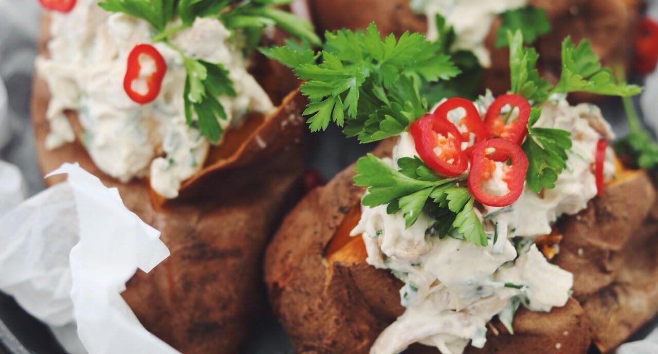 Bagte søde kartofler med kyllingefyld, som man også kan kalde “loaded potatoes”, er en super dejlig og nem ret. Jeg har brugt søde kartofler, men almindelige kartofler kan også sagtens anvendes. Fyldet er en lækker creme fraiche dressing med marineret kylling og urter. Sådan en stor sød kartoffel mætter ret meget, men server gerne en frisk salat til. Jeg har i øvrigt plukket både persille og purløg i min urtehave, ret så hyggeligt, at det allerede titter frem. Rigtig god fornøjelse og god fredag!