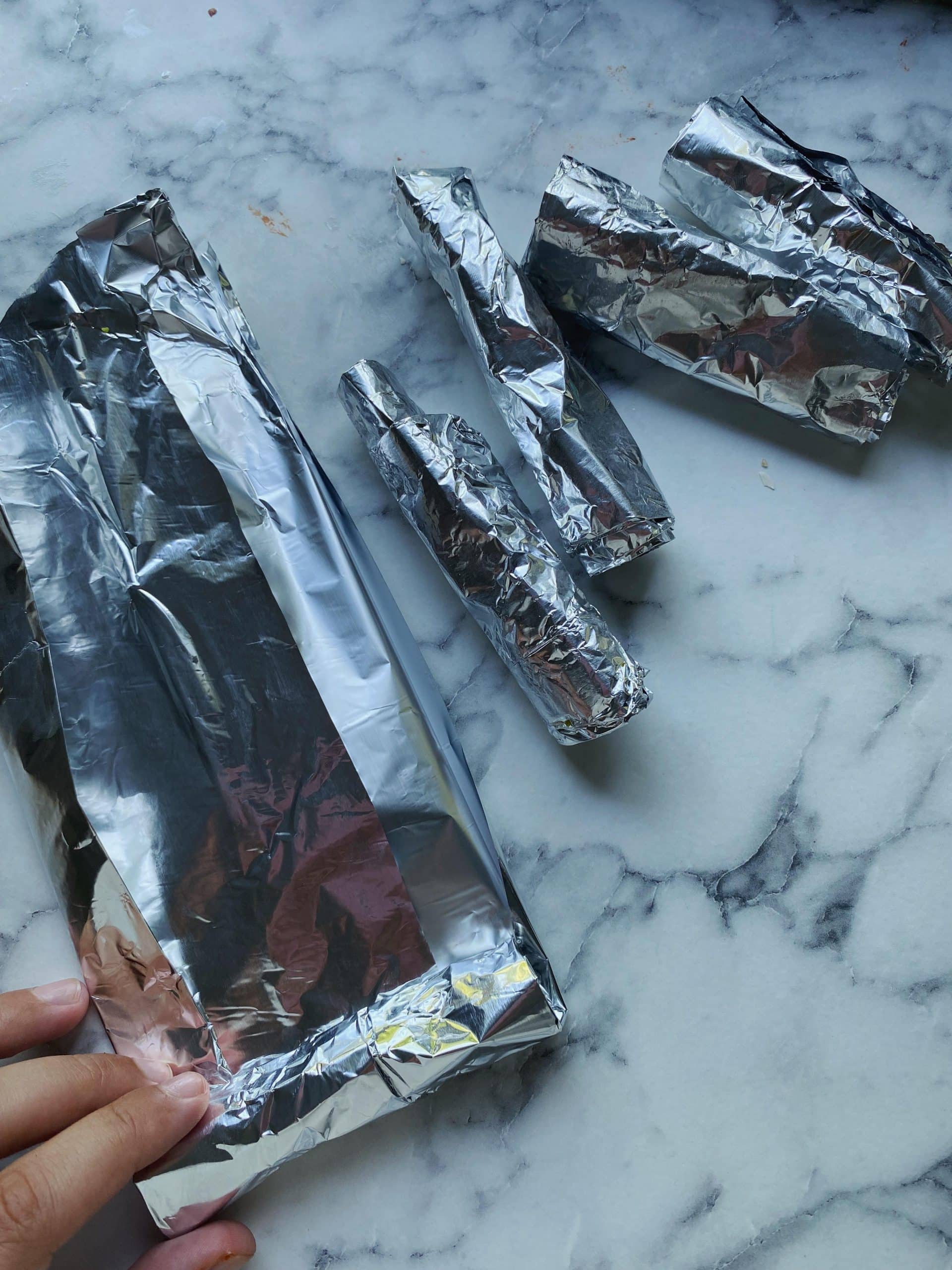 For at baklava rullerne er “hule” indeni og ikke bager sammen, så folder jeg og ruller sådan nogle sølvpapirsruller her. Dejen rulles rundt om sølvpapiret, og de bages med i de første 15 minutter, hvorefter sølvpapiret fjernes, når det er afkølet.