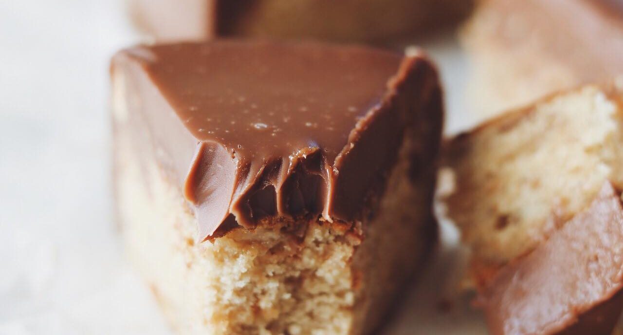Banankage med mælkechokoladeganache og makroner