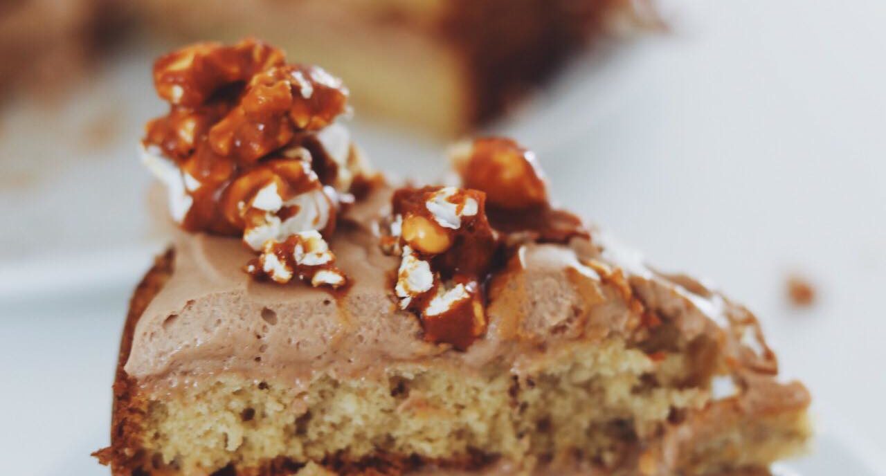 Bananlagkage med chokoladecreme og karamelliserede popcorn