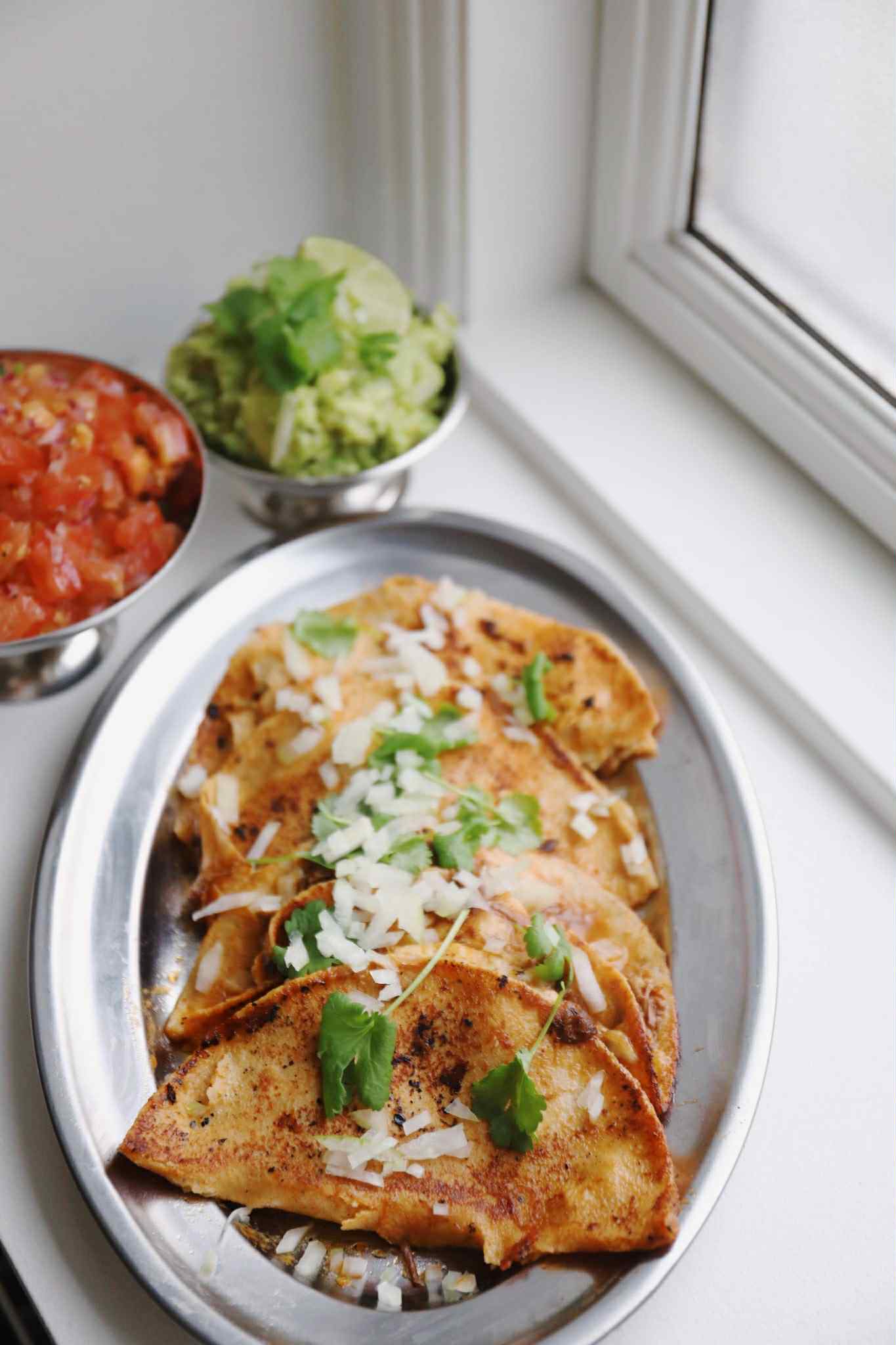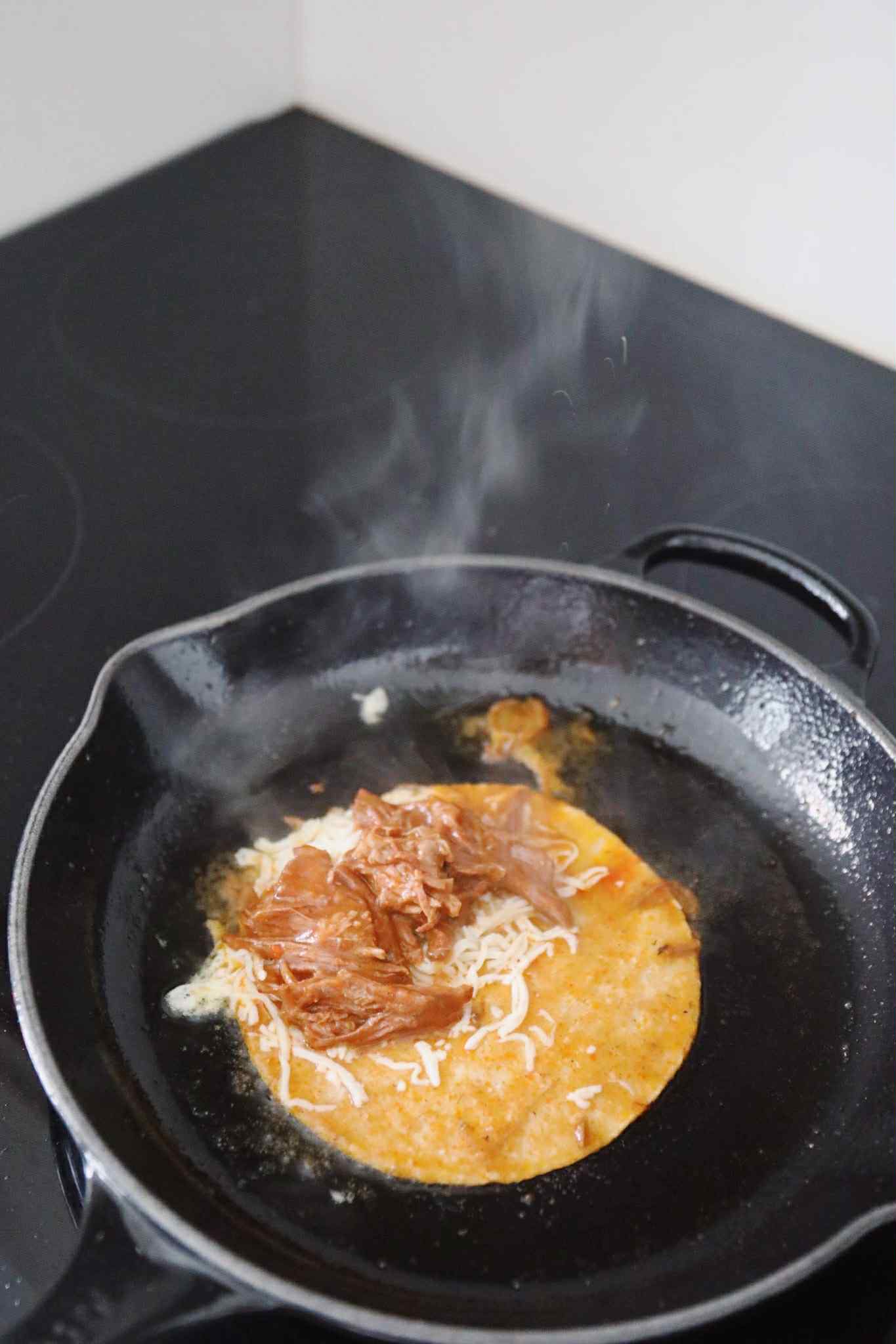 Ved servering dyppes små tortillas i saucen. Så steges de på panden, fyldes med ost og det møre kød og foldes. De steges på begge sider, til tortillas bliver sprøde. Herefter er birria tacos klar til servering pyntet med finthakkede løg og koriander. Jeg bruger oksebov, men man kan også bruge okseklump, oksespidsbryst eller f.eks. lammebov.