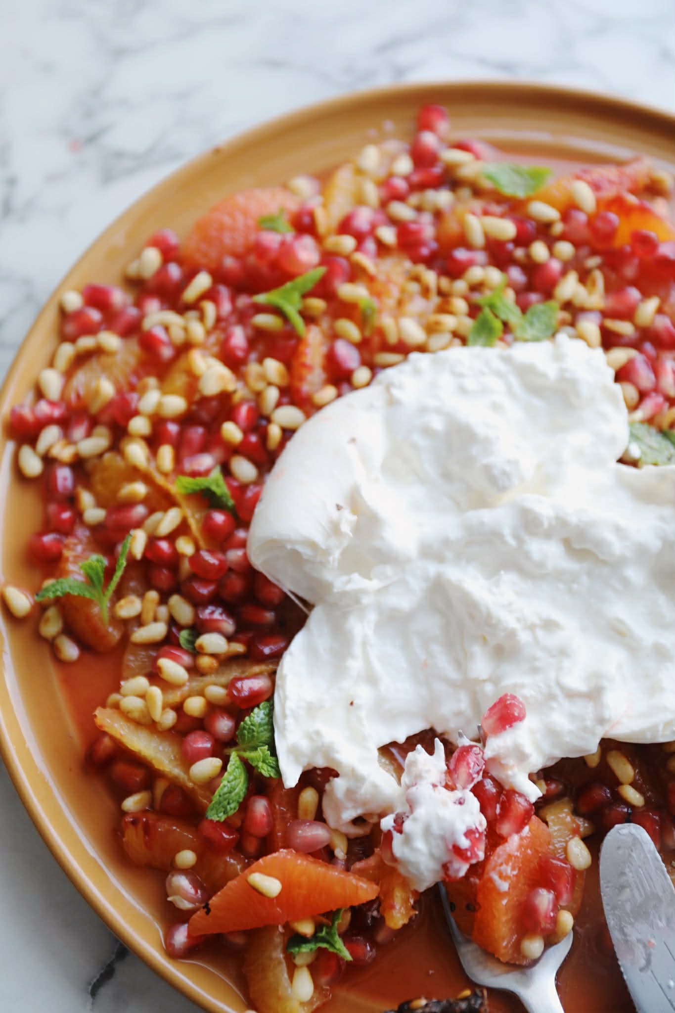 Fordel appelsinfileterne på et fad og placer burrata i midten. Drys med granatæblekerner og pinjekerner.