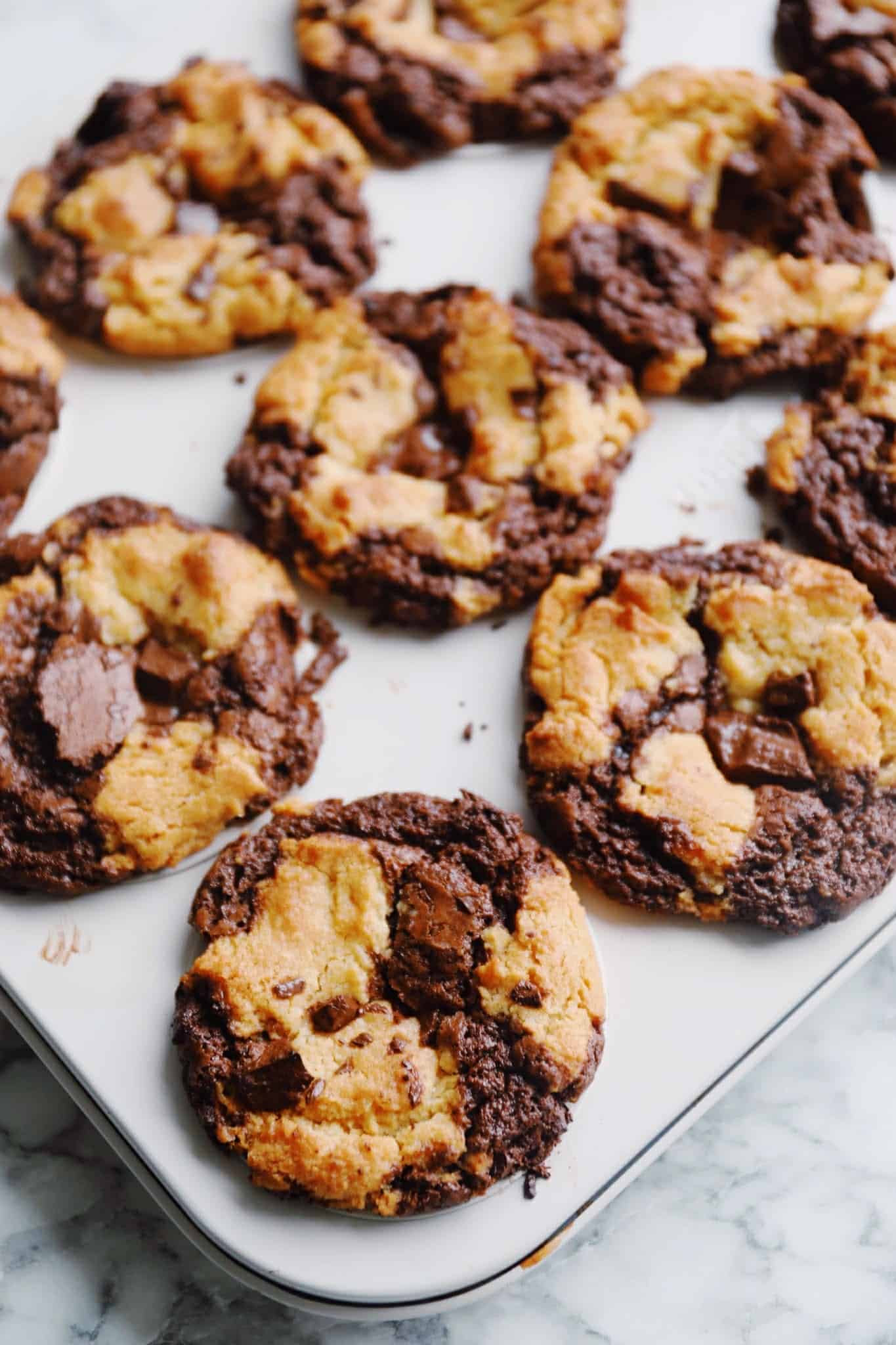Brookie muffins – Her får du opskriften på de lækreste fudgy brownie muffins bagt med sprød cookie dough og chokoladestykker. Disse nemme og skønne cookie brownie muffins har det bedste fra 2 kager: Fudgy brownie dej og sprød og sej cookie dough. Muffins er lavet med inspiration fra min opskrift på brookie kage i bradepande, men jeg tænkte, at det også ville være lækkert at bage kagen i mindre størrelse i muffinsforme.