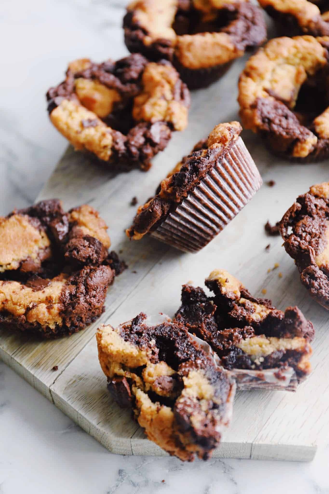 Fordel cookie dough på brownie dejen. Drys med hakket chokolade og bag muffins i ca. 15 min. Lad dem afkøle og server. Velbekomme!