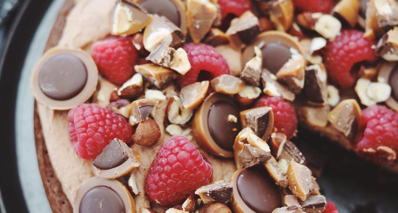 Befri brownien fra springformen og sæt den på et fint fad. Smør chokolademoussen ud på kagen og pynt med hakkede hasselnødder, hakkede og hele Toffifee og nogle friske hindbær. Sæt kagen på køl igen, så moussen kan sætte sig rigtigt. Velbekomme!