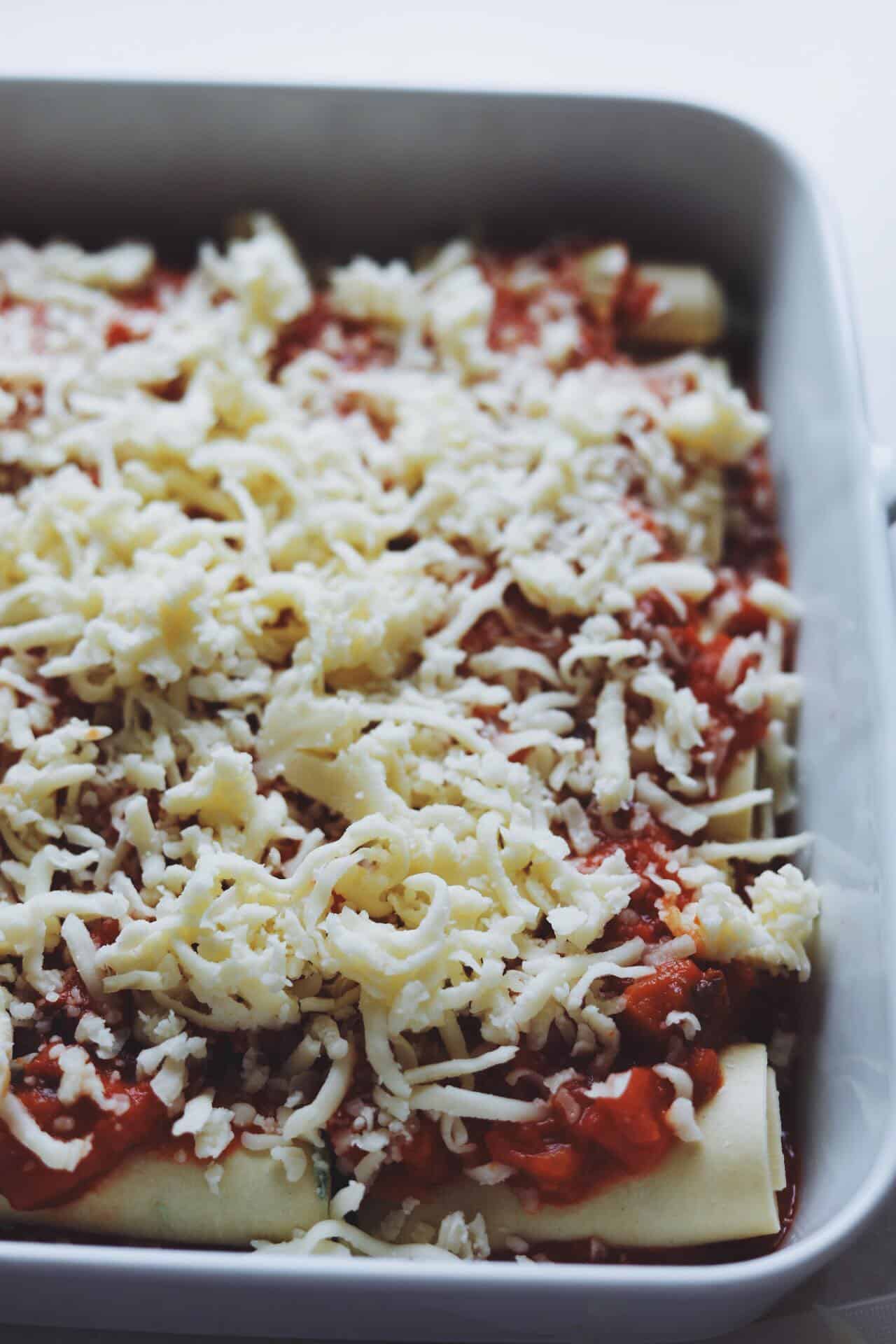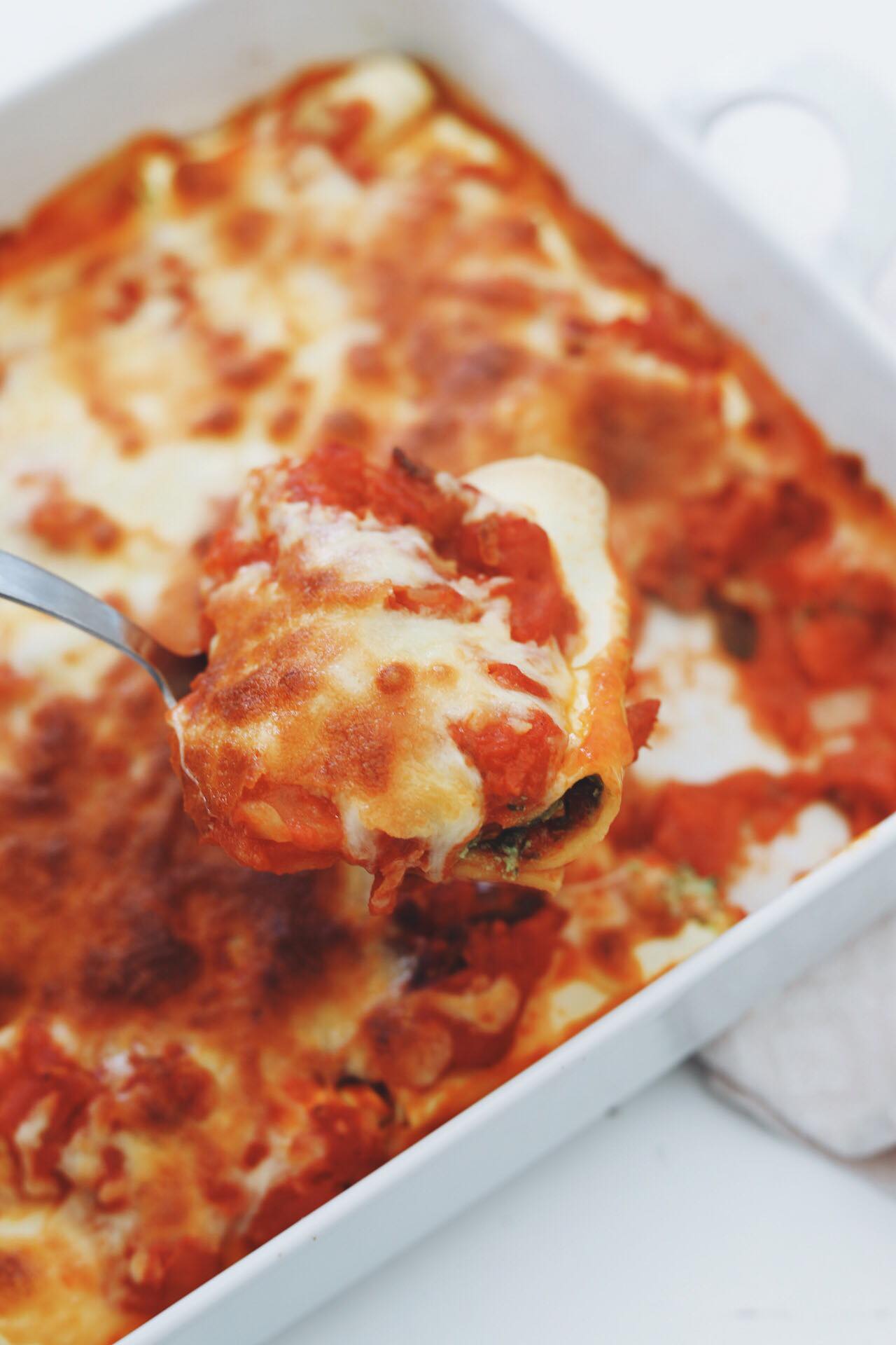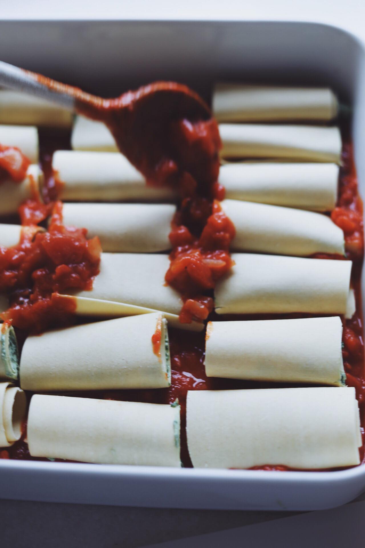 Kom spinat og ricottafyldet i den ene ende af hver lasagneplade og rul den sammen til en rulle. Skær evt. hver rulle i to stykker. Kom halvdelen af tomatsaucen i et ovnfast fad og placer rullerne i rækker i fadet. Kom resten af tomatsaucen udover og fordel osten. Bag retten i ovnen i ca. 20-25 minutter til lasagne pladerne er møre og osten er brun og sprød. Server med det samme. Velbekomme!