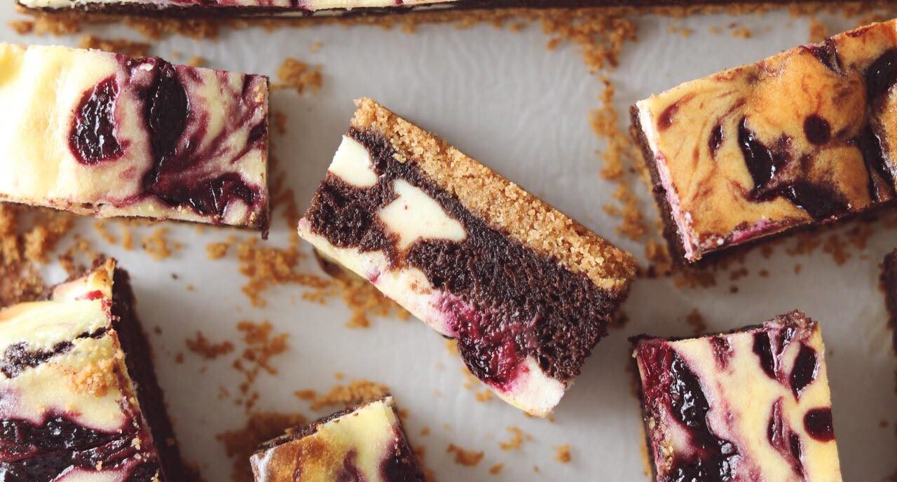 Cheesecake bars med brownie og brombær swirl