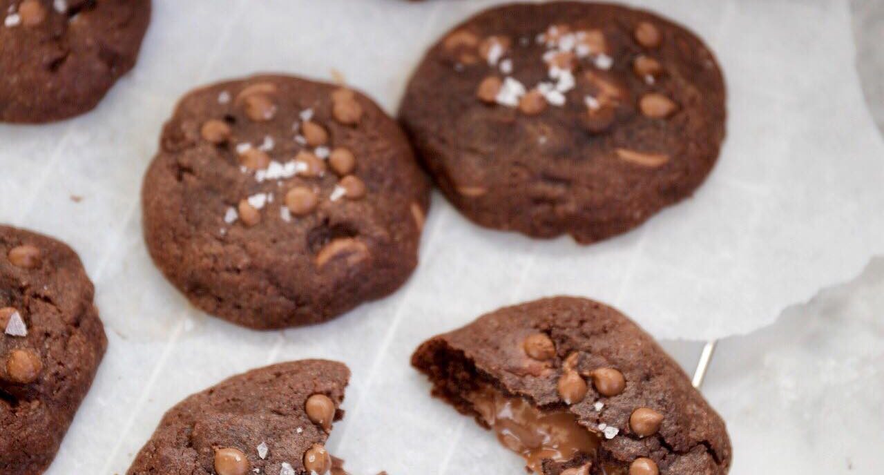 Start med at at sætte 16 skefulde nutella på et stykke bagepair og sæt bagepapiret i fryseren i ca. 30 minutter. Lav cookie dejen ved at piske smør, sukker og brun farin sammen til det bliver cremet. Tilsæt ægget og æggeblommen og pisk igen. Bland mel, vaniljesukker, salt, kakaopulver og bagepulver sammen og pisk det ned i dejen. Tilsæt 50 g chokolade og sæt dejen på køl i ca. 30 minutter.  Tænd ovnen på 175 C. Form 16 lige store (mellem store) kugler af dejen. Tryk dejkuglerne lidt flade og pres dejen rundt om nutellaen. Drys chokolade drops på hver cookie og bage dem i ca. 11-12 minutter i midten af ovnen. Drys havsalt på hver cookie og server cookiesne, imens de stadig er lune. Velbekomme!