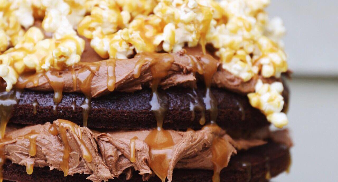 Chocolate layer cake with salted caramel and popcorn!