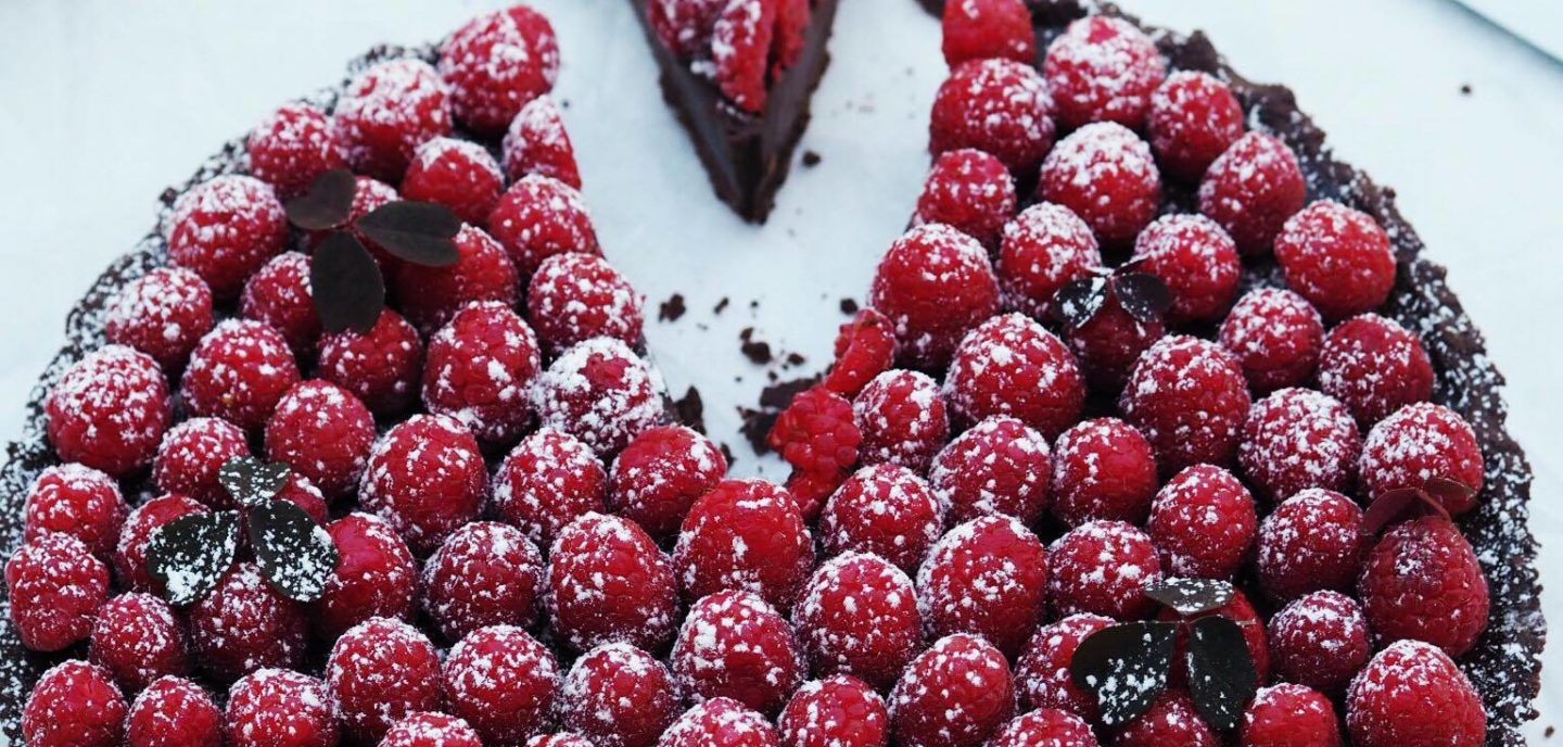 Pynt chokoladetærten med friske hindbær, skovsyre og drys lidt flormelis udover. Velbekomme!