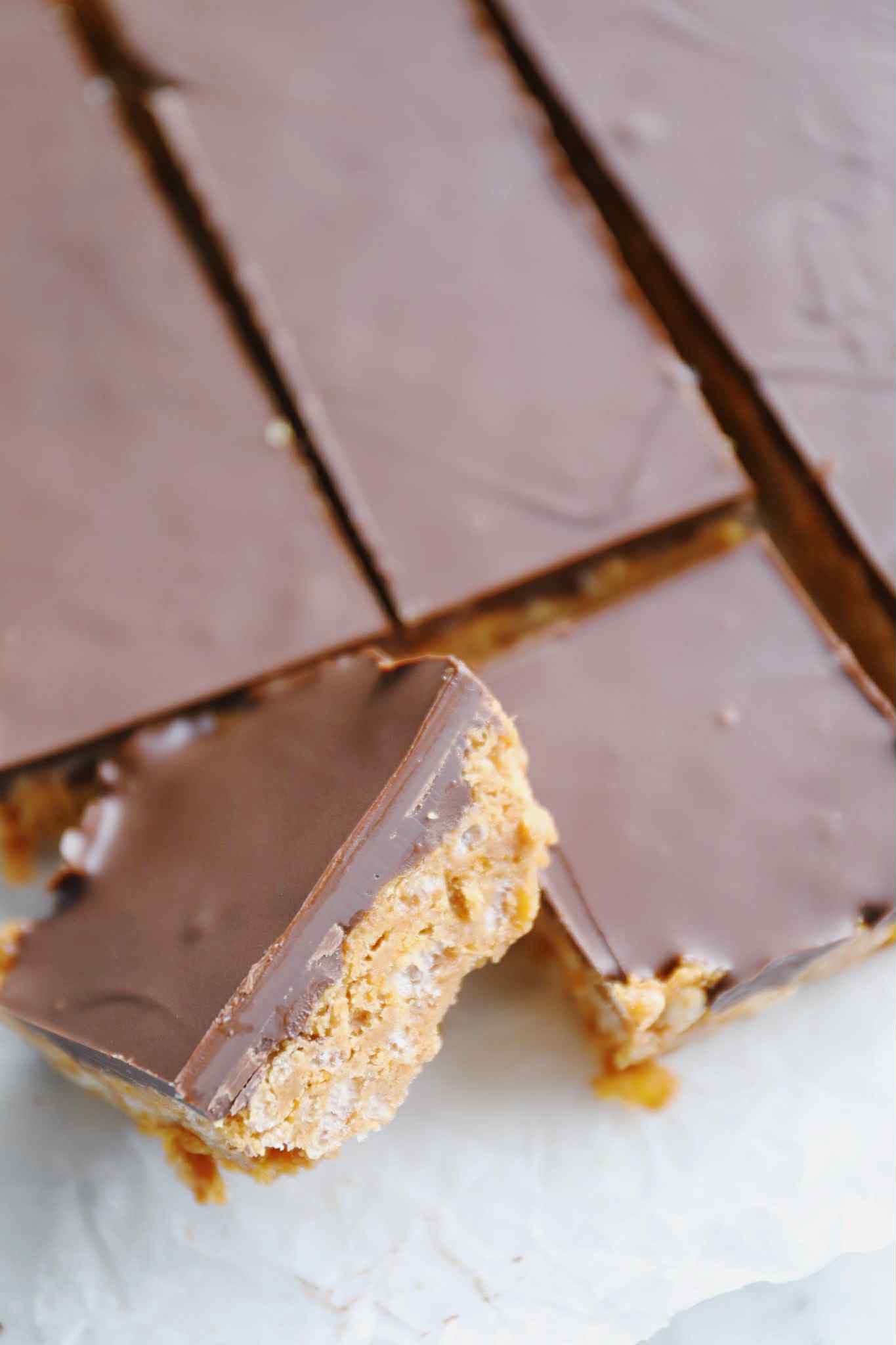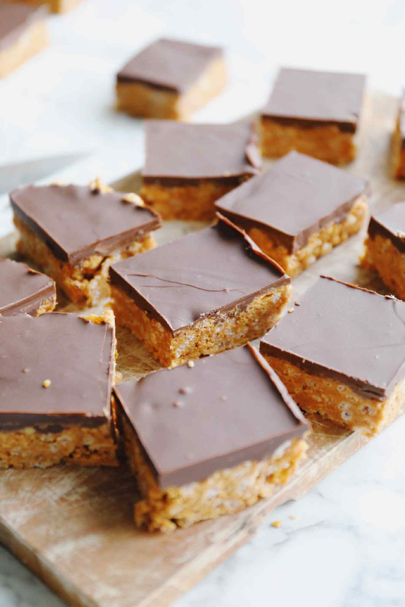 Chokoladebarer med Rice Krispies – Opskrift på de lækreste chokoladebarer med puffede ris aka Rice Krispies, peanutbutter og cornflakes. Crispy, chewy og et silkeblødt tykt lag chokolade – det er altså en herlig kombination. Bunden laves ved at smelte peanutbutter, lys sirup, sukker og salt sammen i en gryde ved svag varme. Det blandes sammen med cornflakes og Rice Krispies og presses ud i en form og stille på køl. Herefter smeltes nougat og mørk chokolade sammen og fordeles på den kolde bund. Når massen har sat sig og chokoladen er størknet, så kan den skæres ud til lækre chokoladebarer med en skarp og varm kniv.