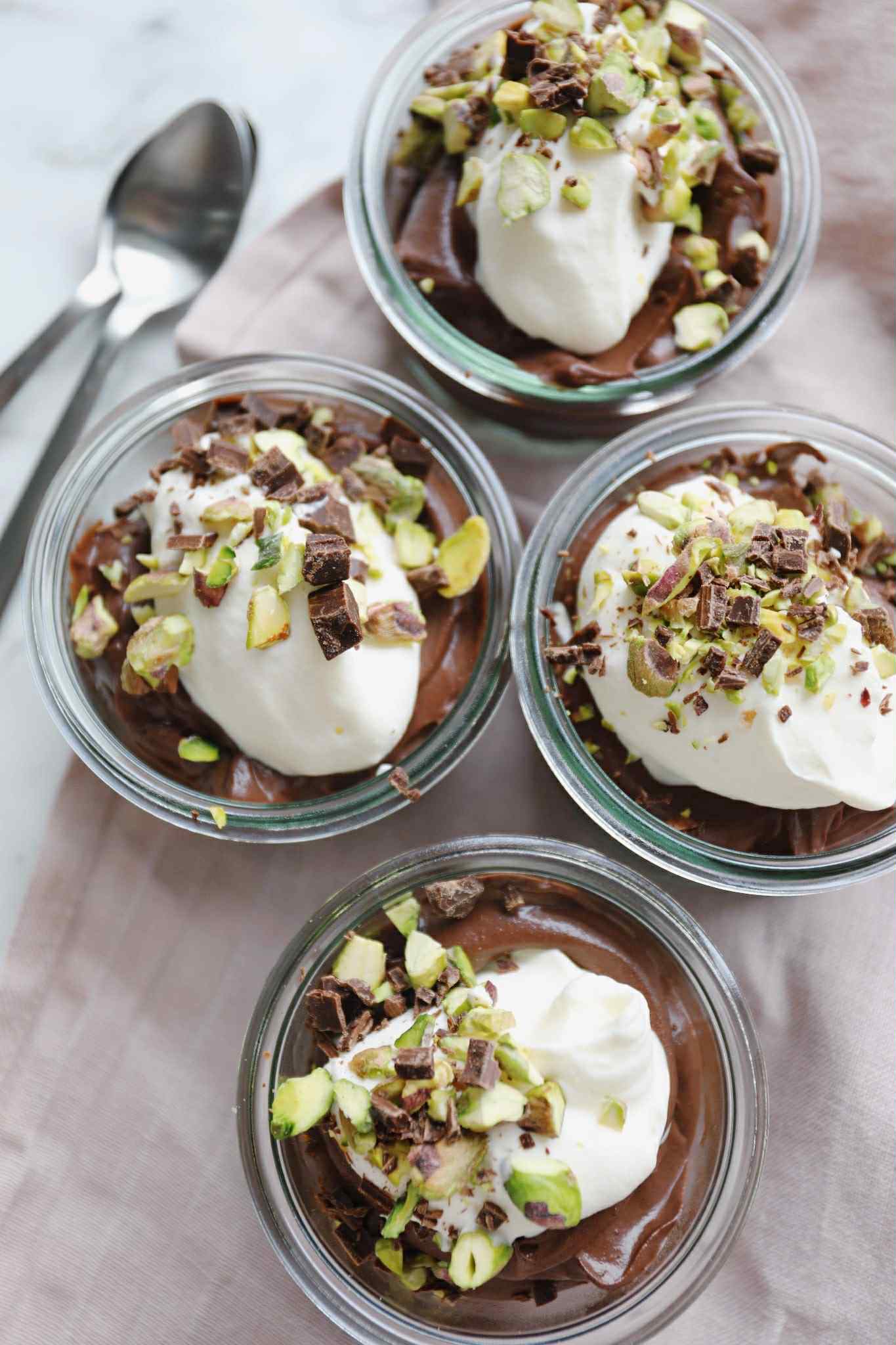 Pynt moussen med flødeskum, hakkede pistacienødder og hakket chokolade. Velbekomme!