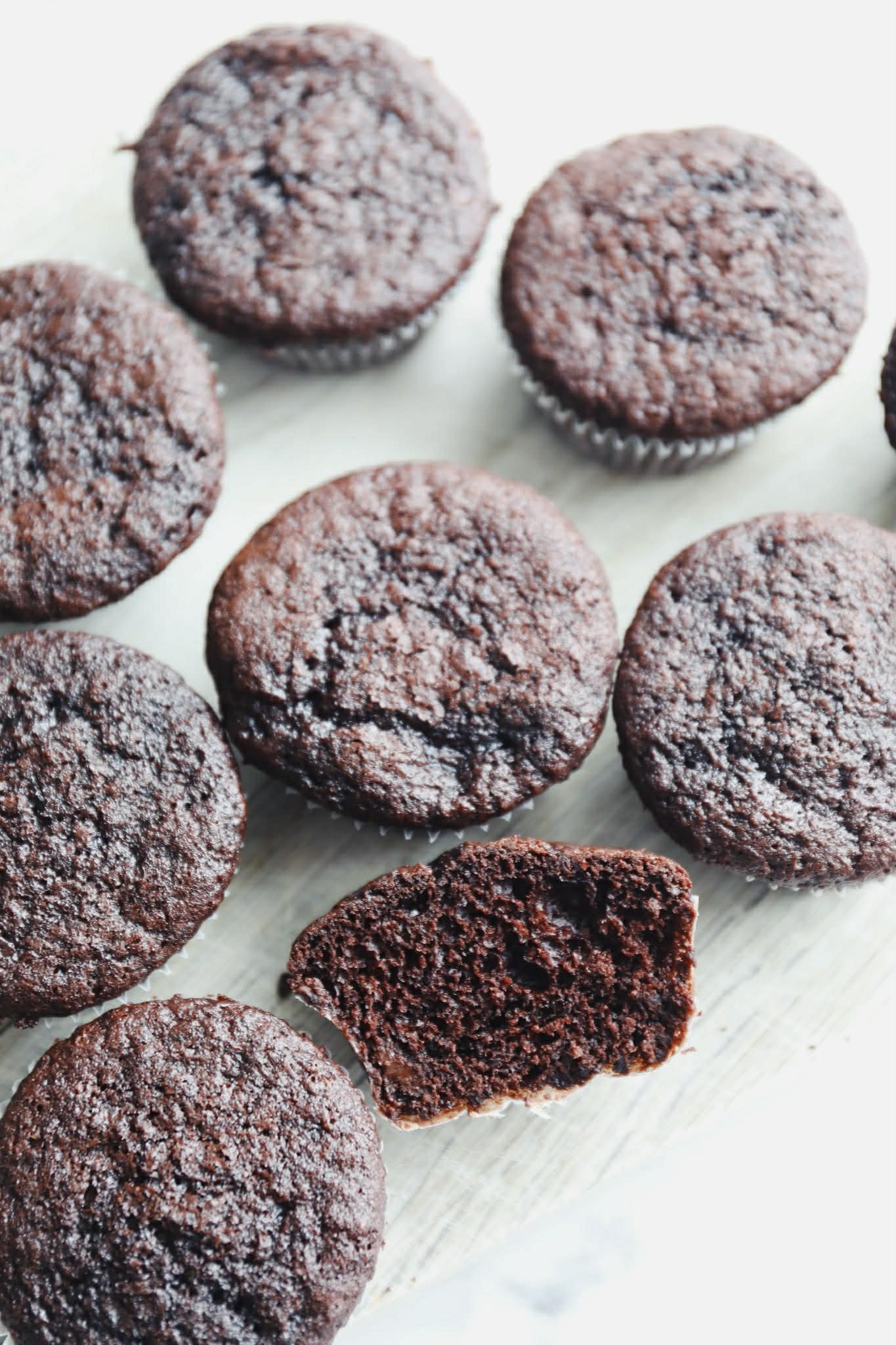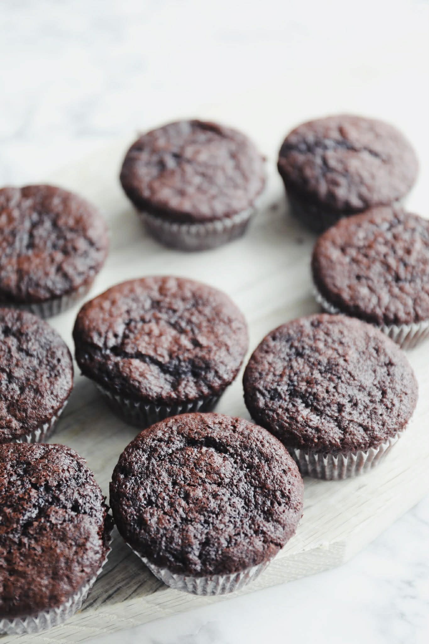 Jeg har også en anden opskrift på svampede chokolademuffins, hvor dejen er lidt anderledes og muffins bliver lidt større end disse gør. Chokolademuffins er også helt ideelle at fryse ned og kan tøes op, når chokoladekage-sulten melder sig. Prøv også min opskrift på kanelmuffins med glasur. Rigtig god fornøjelse!