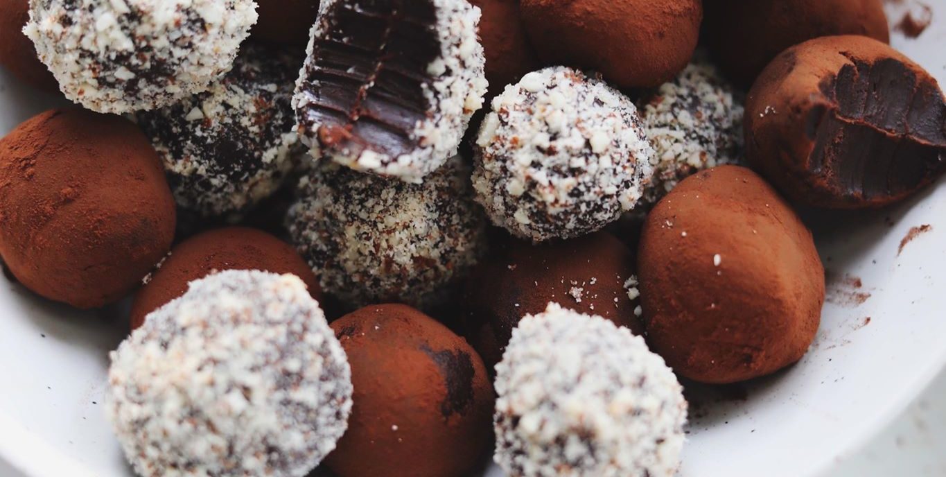 Jeg har rullet disse chokoladetrøfler i kakaopulver og finthakkede hasselnødder, men prøv også med frysetørret bær eller bærpulver. Rigtig god fornøjelse!