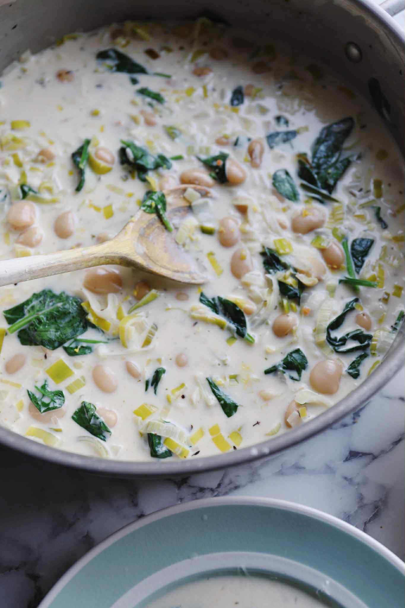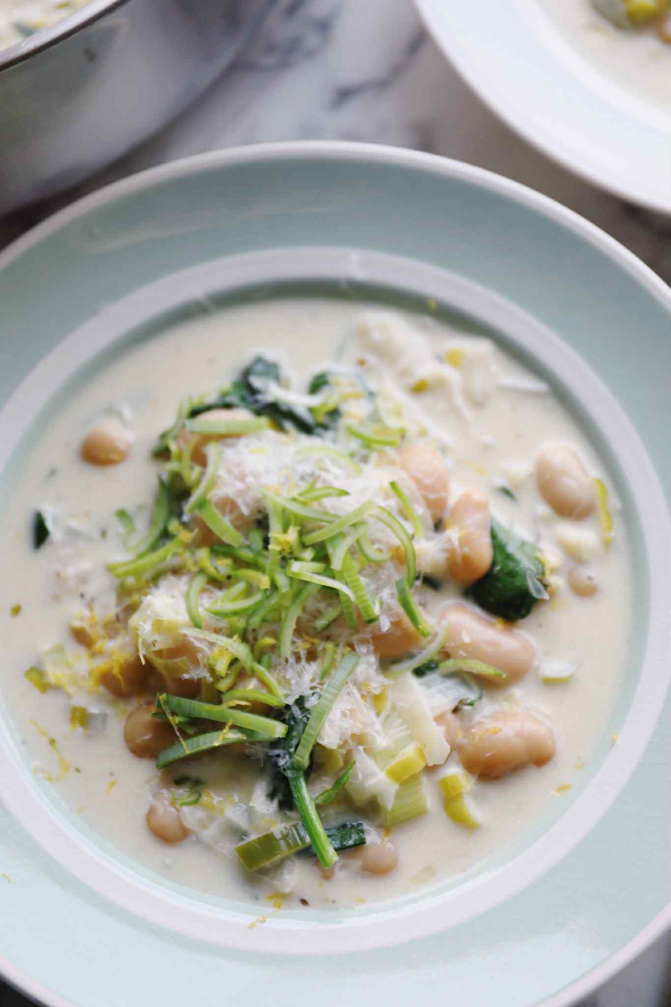 Cremet suppe med butterbeans – Opskrift på den lækreste vegetariske suppe med butterbeans, porrer, citron og flødeost. Denne cremede suppe med butter beans er så god og meget nem at lave. Suppen består af løg, hvidløg og porrer som svitses i smør. Der hældes bouillon og piskefløde på sammen med tørret timian, citronsaft og flødeost. Derefter tilsættes der butterbeans som simrer med. Lige inden servering tilsættes frisk spinat og suppen smages til. Suppen serveres med fintsnittet porretop, revet parmesan og fintrevet citronskal.