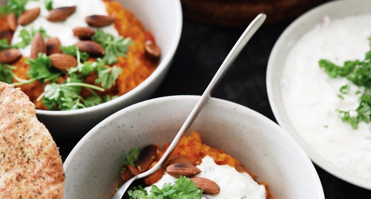 Server den varme Dhal med raita, lunt naan brød, persille eller koriander og mandler ristet på en tør pande. Velbekomme!