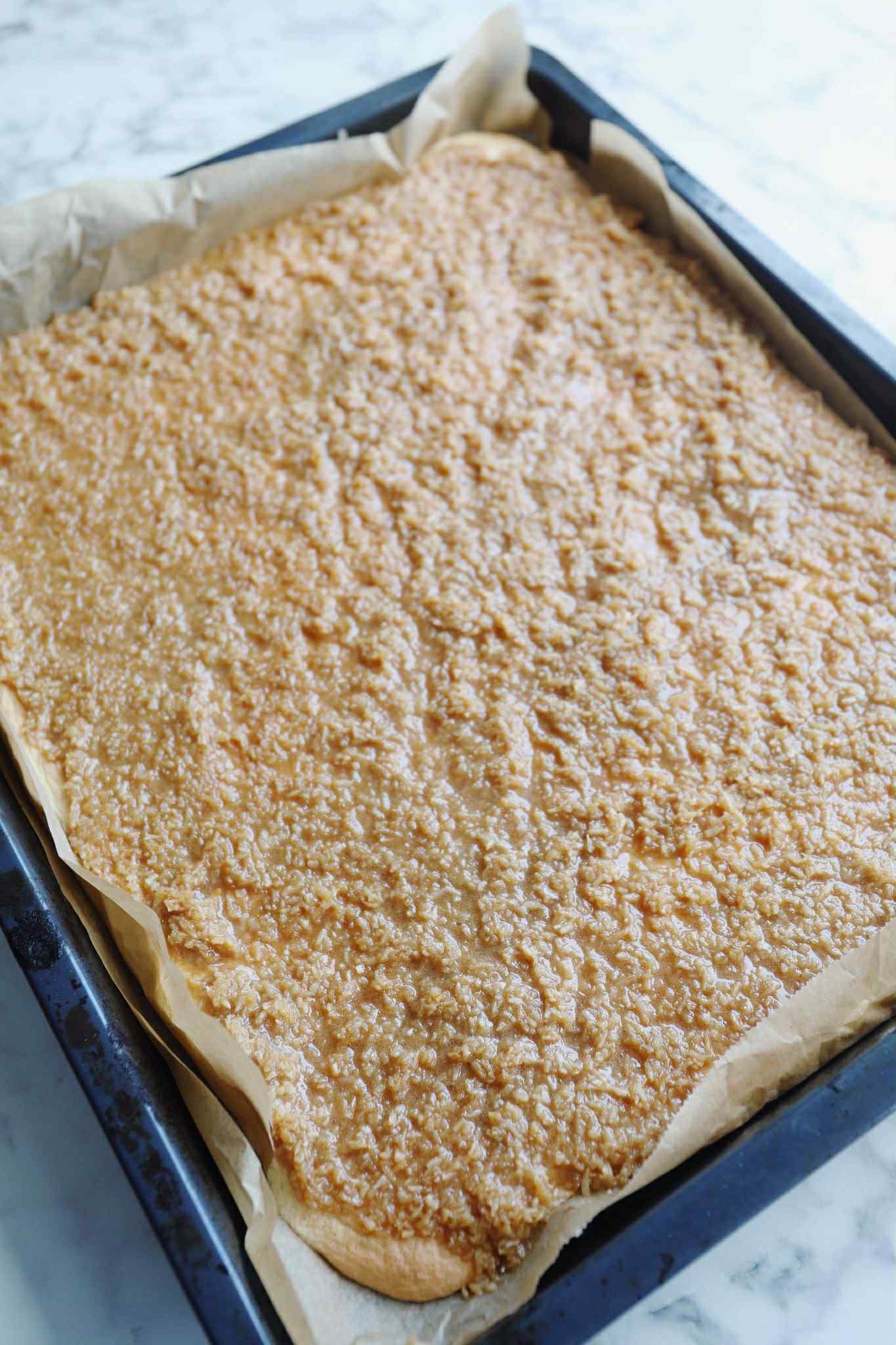 Beklæd en dyb bradepande til ovnen (min er ca. 37×45 cm) med bagepapir. Hæld dejen i og smør ud i et jævnt lag. Bag bunden i 4 min.