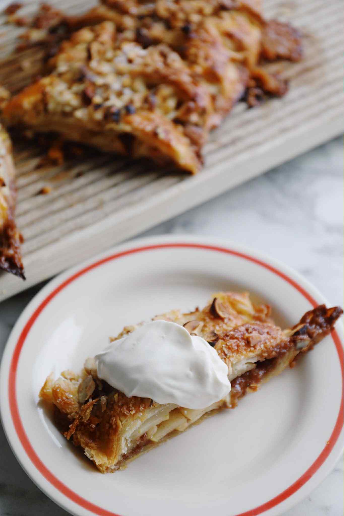 Roll out the puff pastry on a baking sheet lined with parchment paper. Spread the remonce down the middle of the dough (lengthwise) and top with the apples.
