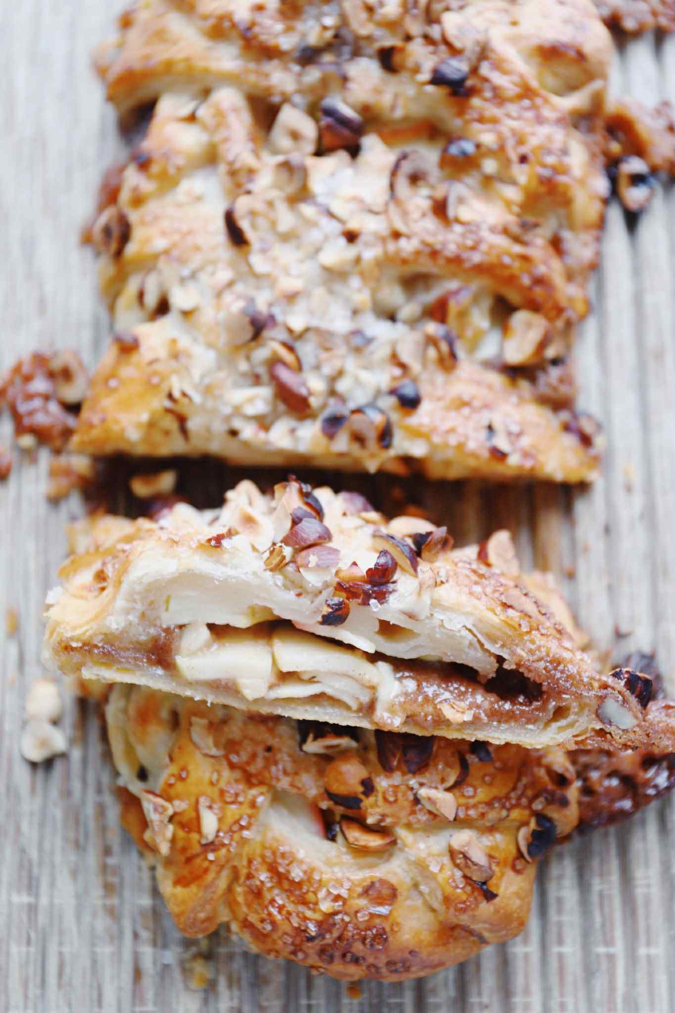 The apple braid is made with puff pastry, spread in the middle with a remonce made from marzipan, cinnamon, and cardamom, and then topped with sliced apples mixed with lemon and brown sugar. The dough is cut into diagonal strips and braided over the filling. It doesn’t matter if it doesn’t look perfect — it’s fine if it looks a bit rustic. Before baking, the braid is brushed with egg and sprinkled with chopped hazelnuts and pearl sugar.