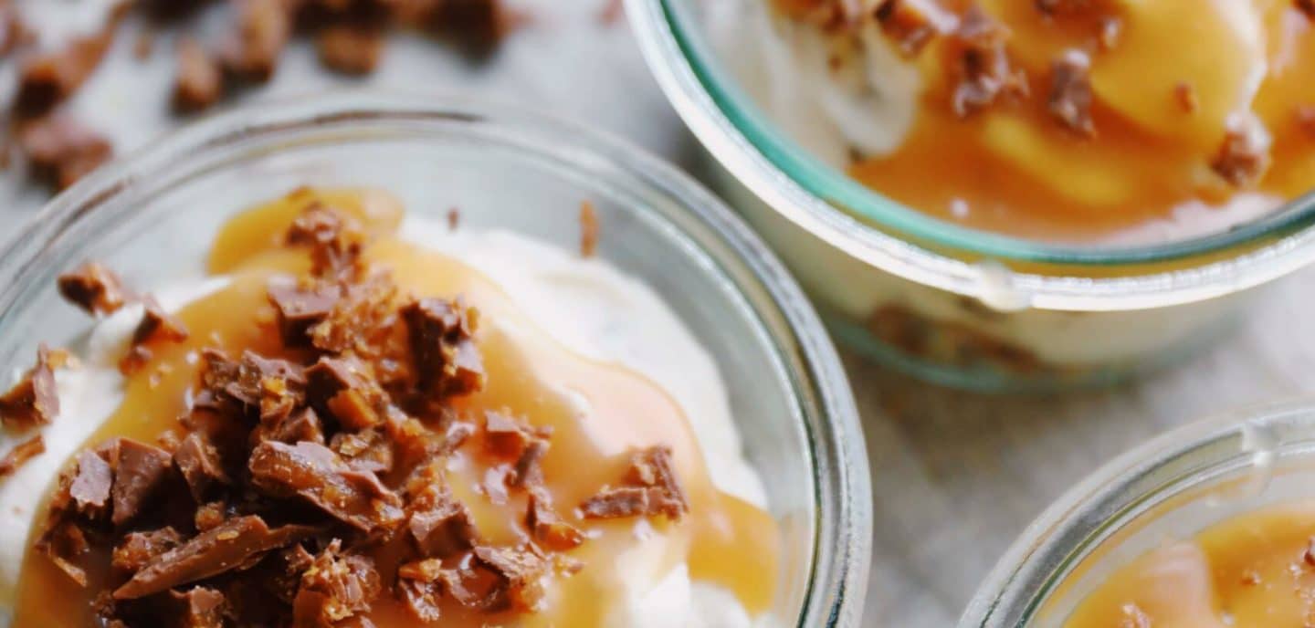 Daim cheesecake in a glass – Recipe for easy Daim cheesecake with homemade caramel sauce served in a glass. One of my most popular recipes here on the blog, it is min Daim cheesecake. It’s so easy and delicious and a real crowd-pleaser, and it’s a cake pretty much anyone can make. Now I have made the cake in small serving glasses instead of a large cake. The dessert consists of a biscuit base with the most delicious cream cheese with Daim, homemade caramel sauce and chopped Daim on top. The cheesecake filling is made without leavening, so it is therefore important that the cream is whipped to a firm foam and carefully turned with the cream cheese, as this way it holds its shape and does not clump together.