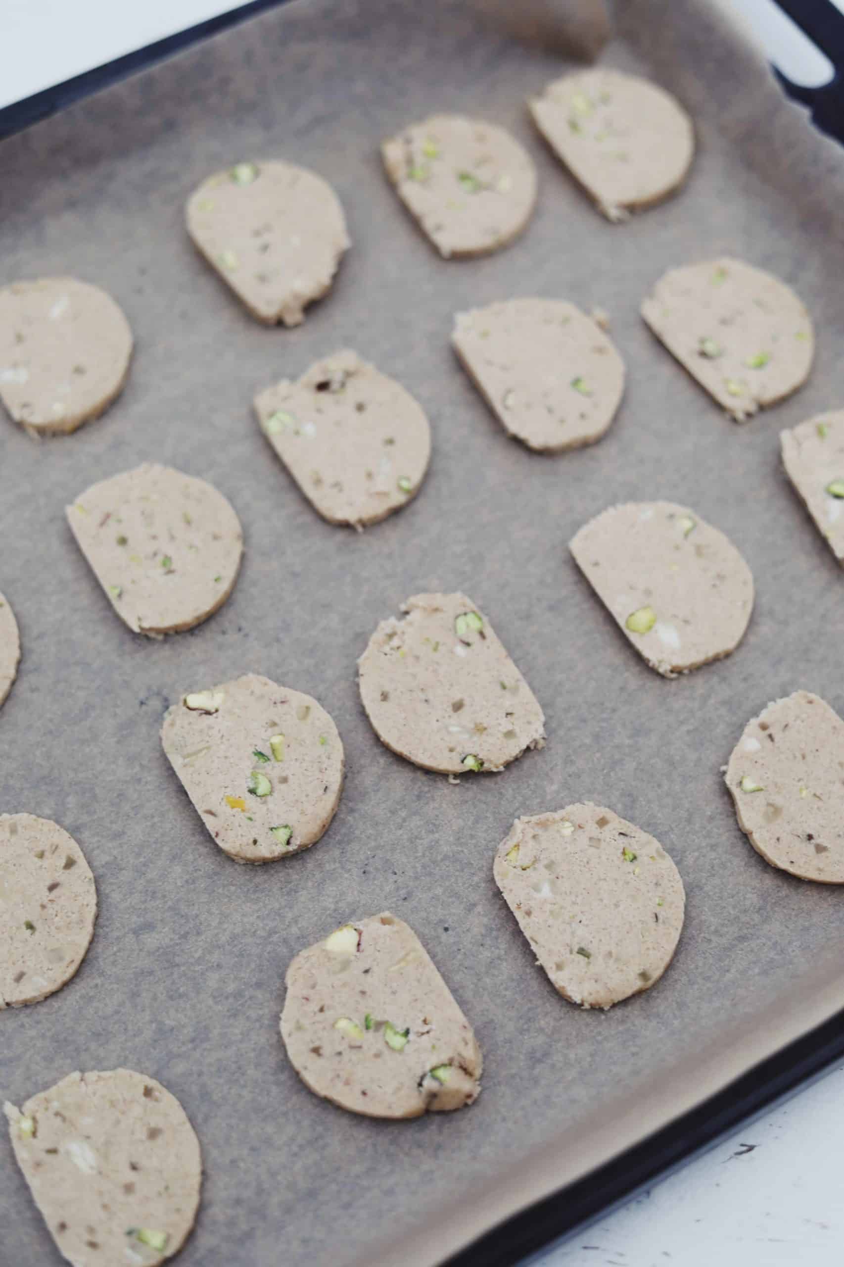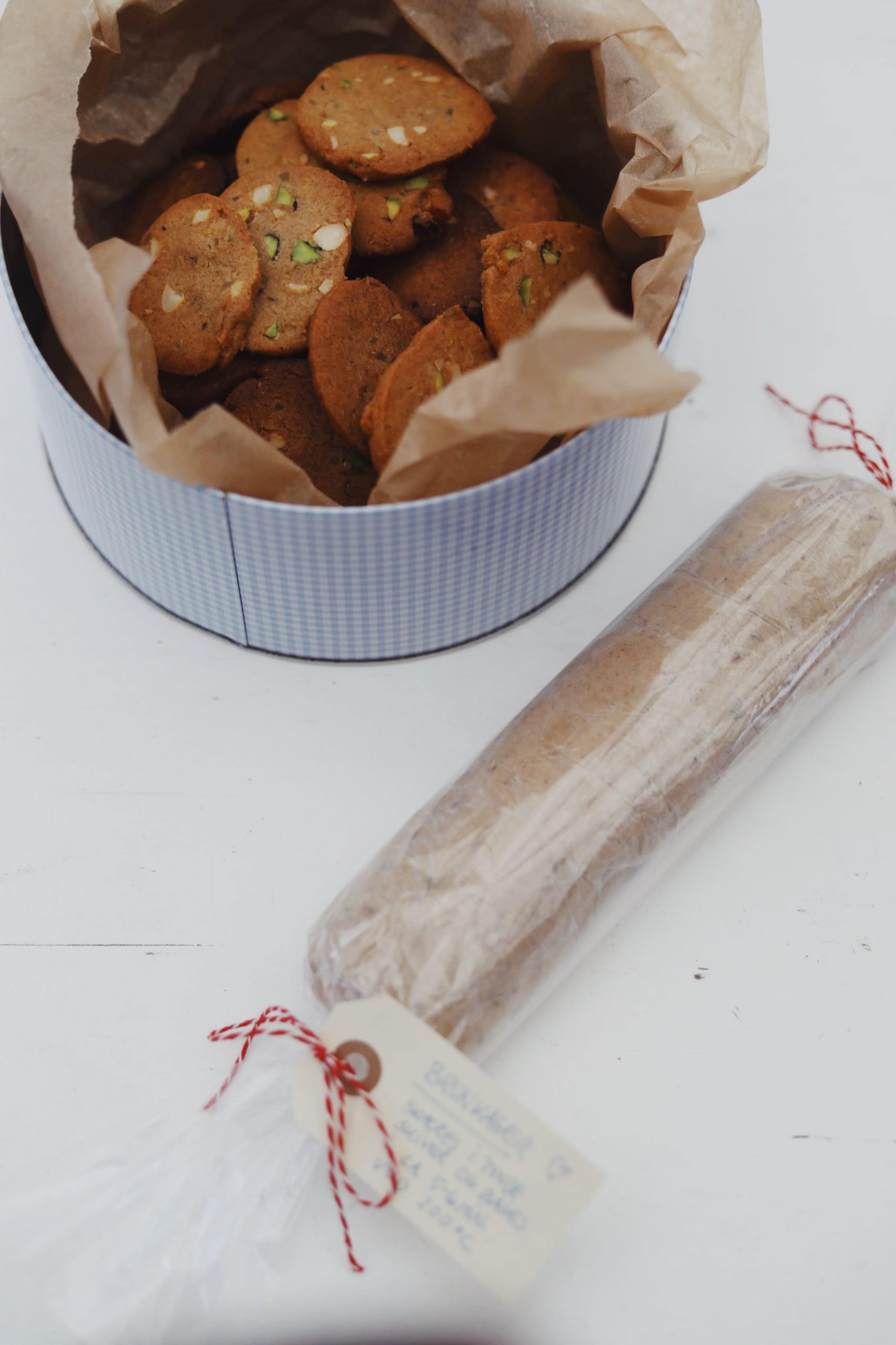 When you are going to bake the gingerbread, cut the cold dough into thin slices with a sharp knife. Only take one roll out of the refrigerator at a time as you need it, and put the dough back in the refrigerator if it gets too warm. The brownie dough can easily keep for 1-2 weeks in the refrigerator. (If you are more impulsive and just suddenly want to bake brownies, you can also bake them the same day, just make sure the cookie dough has time to get cold enough to be cut.)