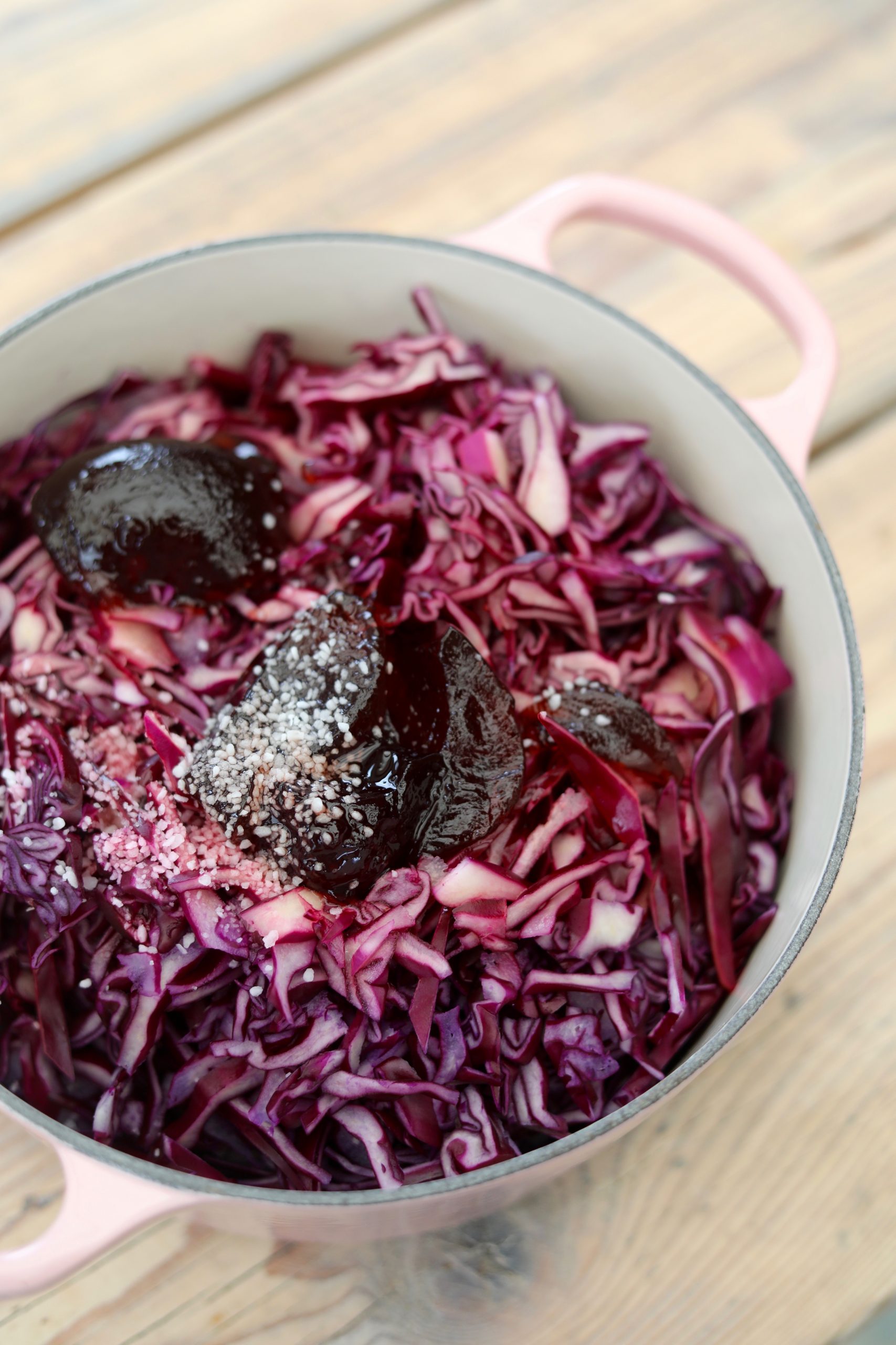 Heat the pot until it starts to boil around the red cabbage, stir and turn down the heat so that the cabbage is just simmering. Let it cook over low heat for an hour and taste the cabbage to see if you need to add a little extra salt or cane sugar.