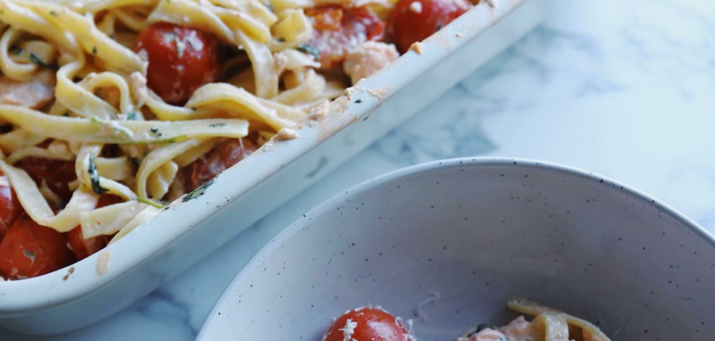 Pasta with salmon, cream cheese and spinach – Recipe for delicious and creamy pasta baked in the oven with salmon, cream cheese, spinach and tomatoes. This pasta dish is so easy and really delicious. The pasta dish consists of cream cheese which is baked in a dish together with cherry tomatoes, fresh salmon, fresh spinach, onion, garlic and olive oil. The whole thing is then turned together and cooked pasta is added to the dish. It’s a super child-friendly dish and it’s also really good to serve for dinner on weekdays. The dish really just takes care of itself in the oven, and then you only have to cook the pasta on the side. Fresh pasta or other types of pasta can be used here.