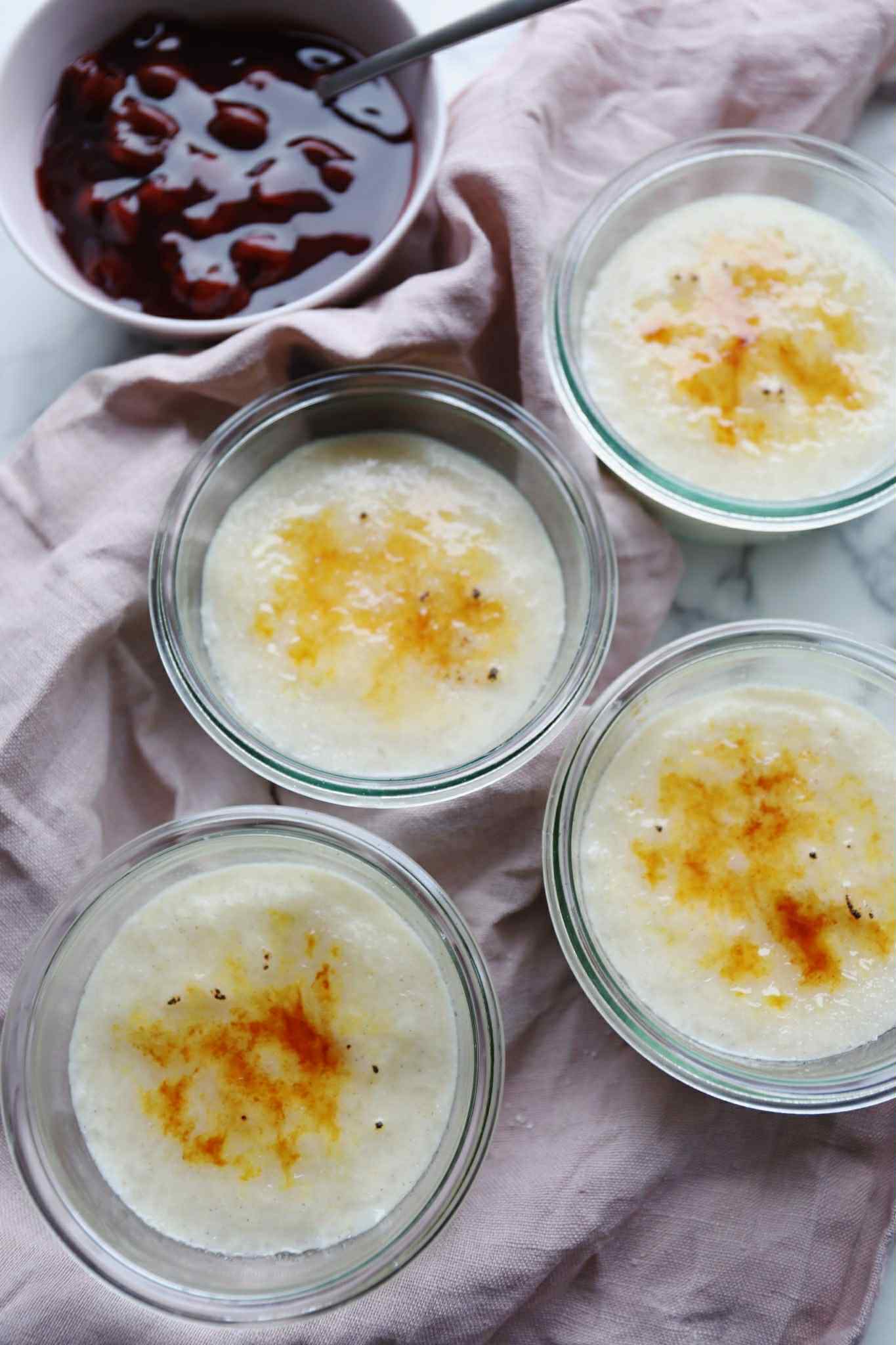 Risalamande Crème Brûlée – Recipe for creamy risalamande crème brûlée with a crispy caramelized sugar top, served with cherry sauce.