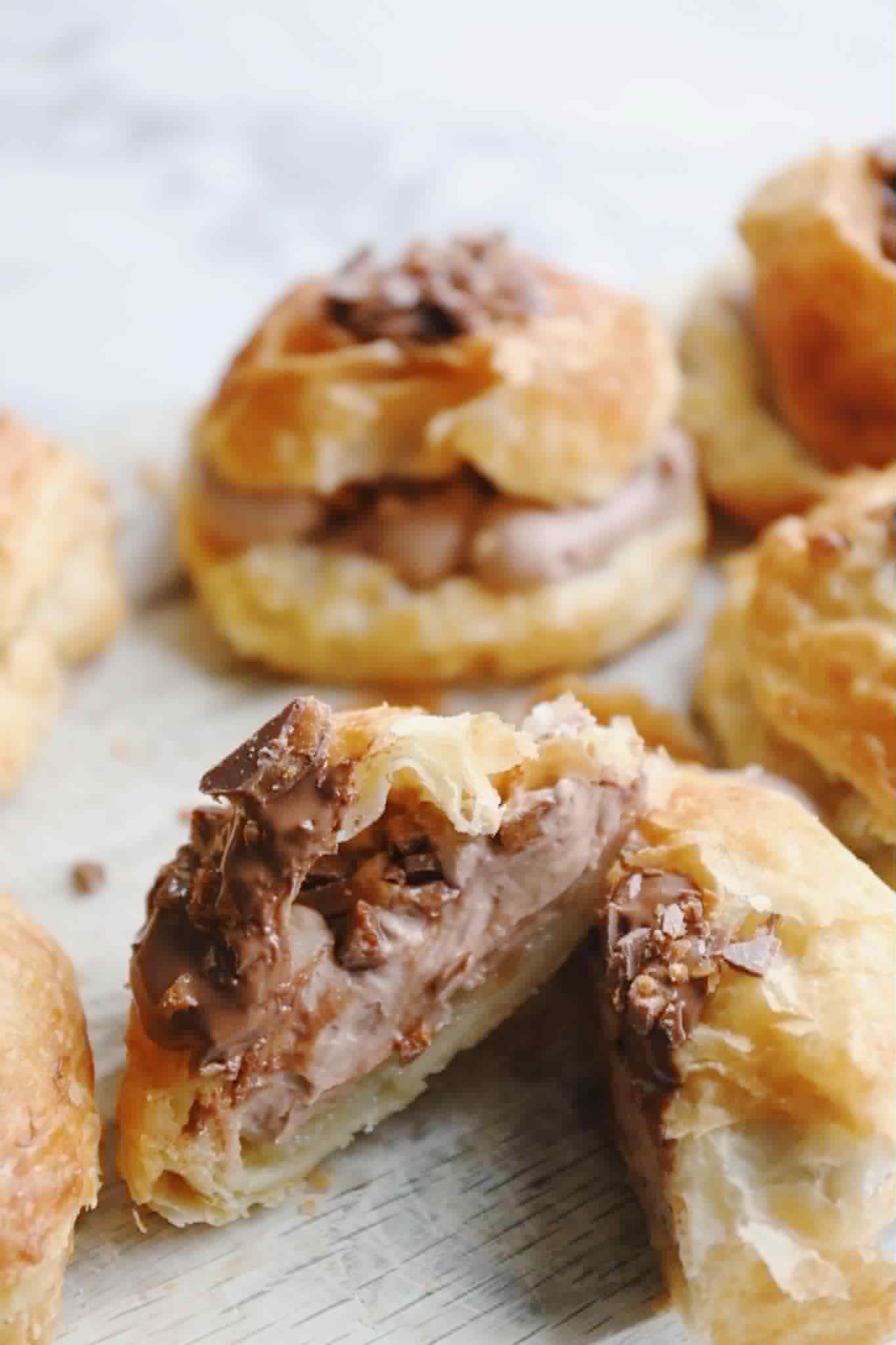 Opskrift på lækre og hurtige fastelavnsboller med chokoladecreme og Daim fyldt i en wienerbrødsdej. Disse fastelavnsboller er lidt en snyde-udgave, da selve bollerne er købt fra frost. Det er wienerbrødsdej, hvor de allerede er formet til boller med remonce i. Cremen er også lidt en snyde creme, da den er lavet med et brev kagecreme.