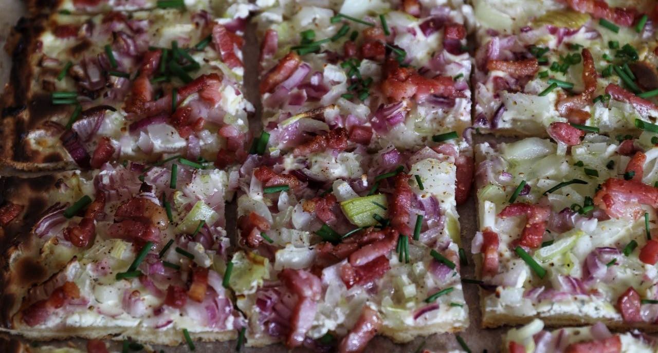 Flammkuchen – Den lækreste sprøde pizza med creme fraiche, løg og bacon
