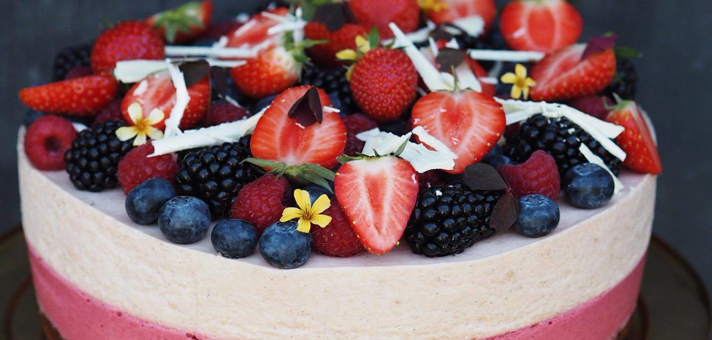 Befri kagen fra formen og tag forsigtigt kageplasten af (brug evt. en varm kniv til at løsne med). Sæt kagen på det fad den skal serveres på og pynt den ligesom du har lyst til. Jeg har pyntet min kage med friske bær, skovsyre og hvid chokolade. Velbekomme!
