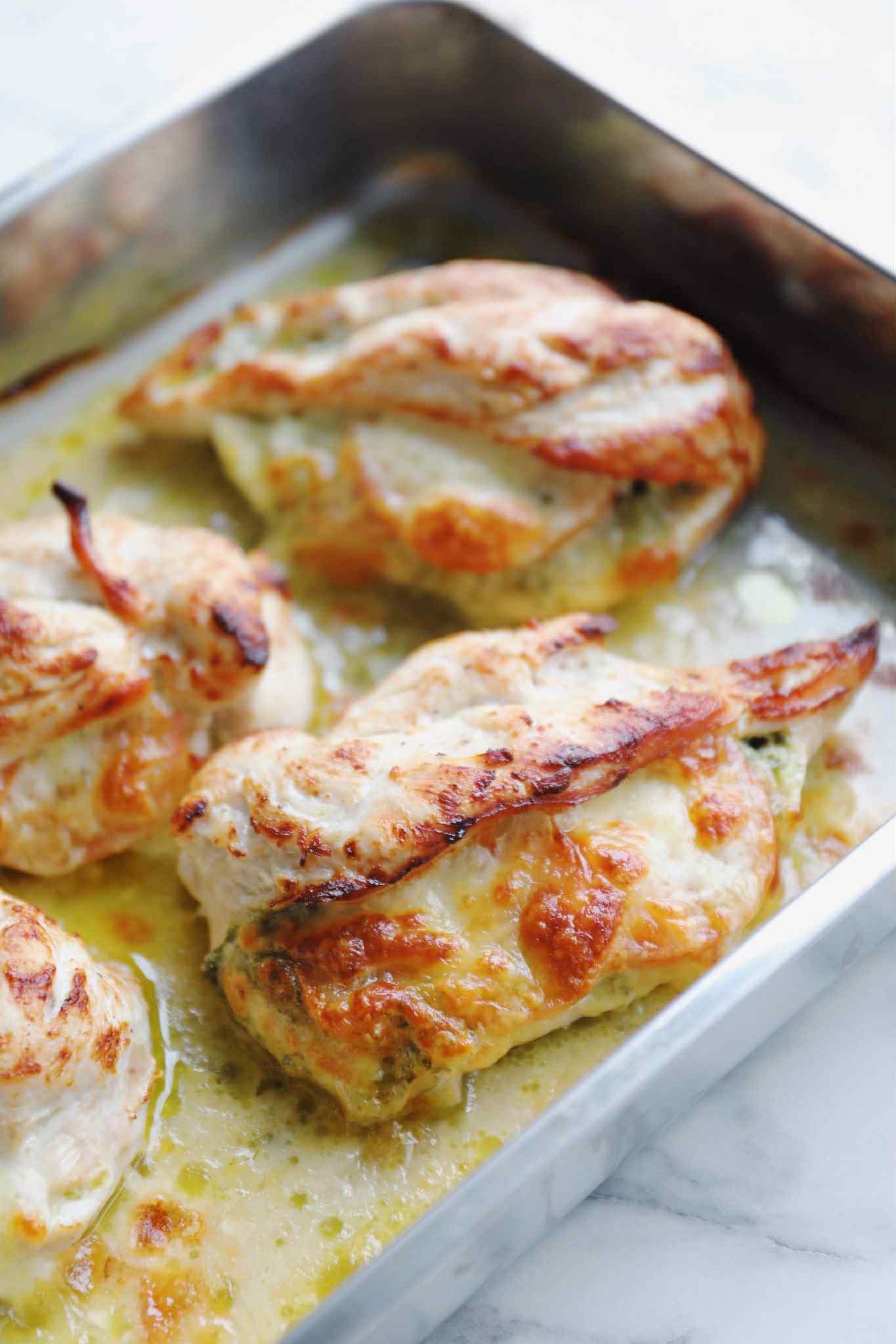 Kom kyllingebrysterne op i et fad og bag kyllingen i ca. 25 minutter. Lad kyllingen hvile et par minutter og server herefter. Velbekomme!