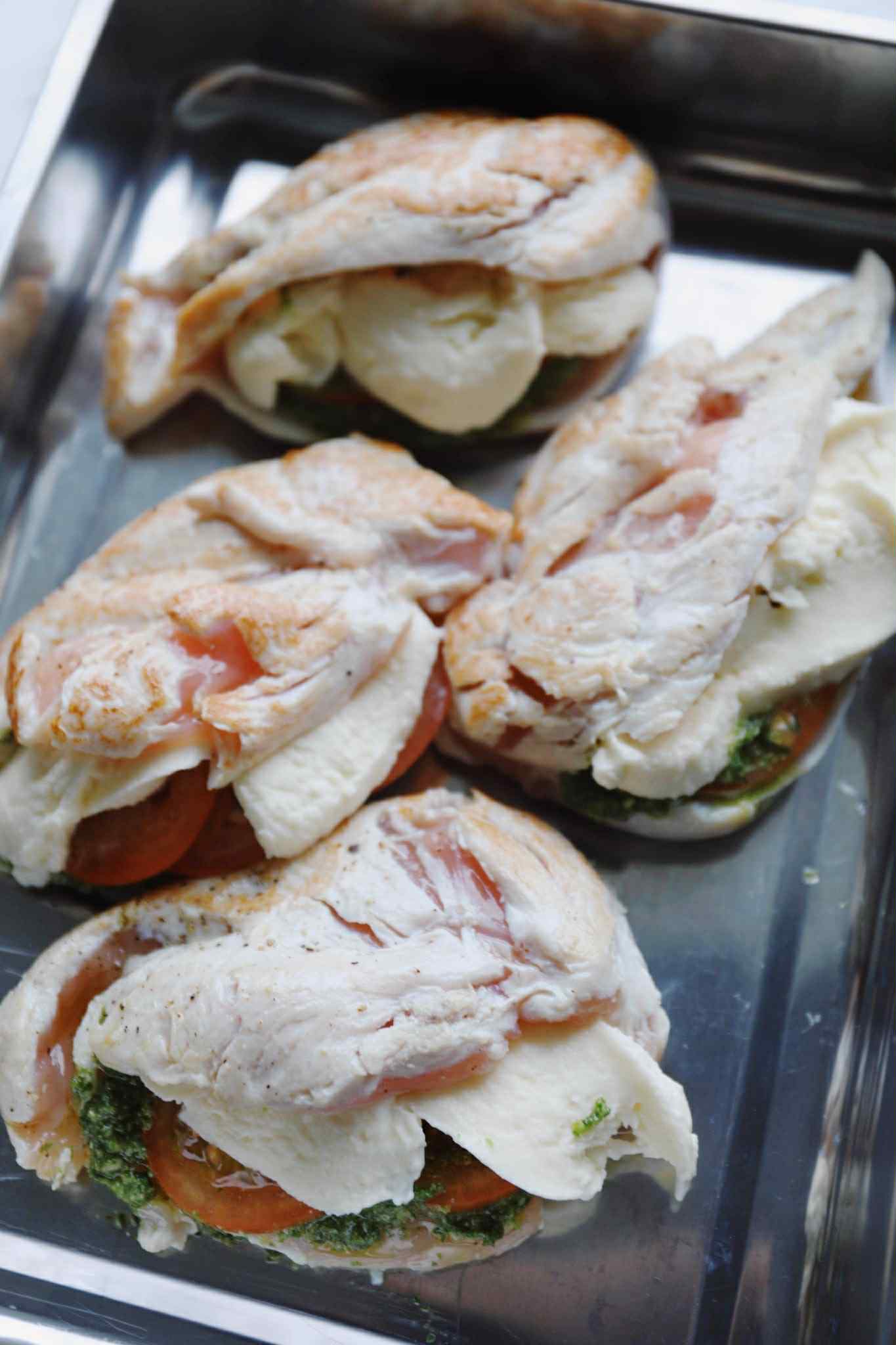Skær en “lomme” i hvert kyllingebryst og fyld med pesto, tomat og mozzarella.
