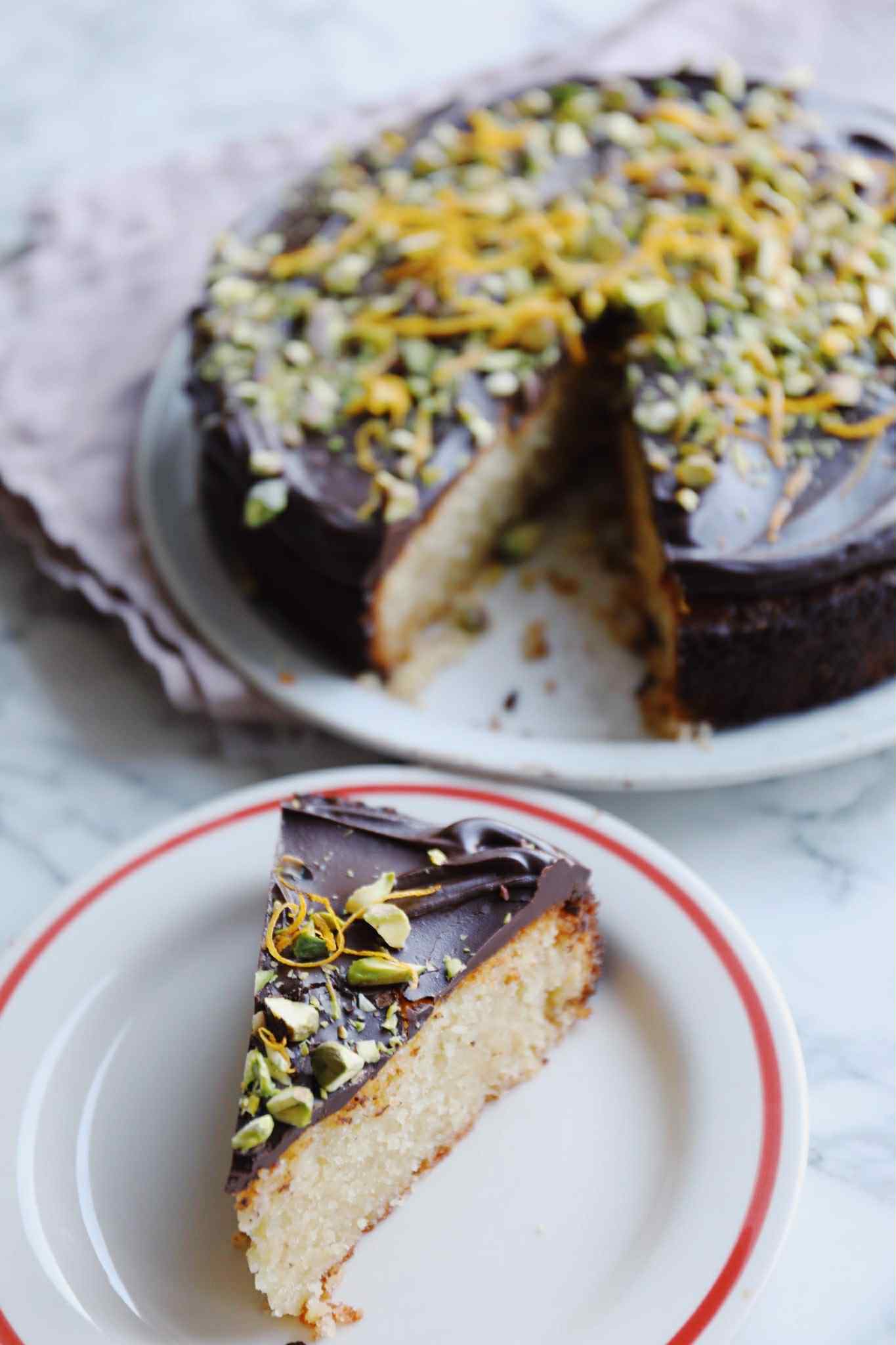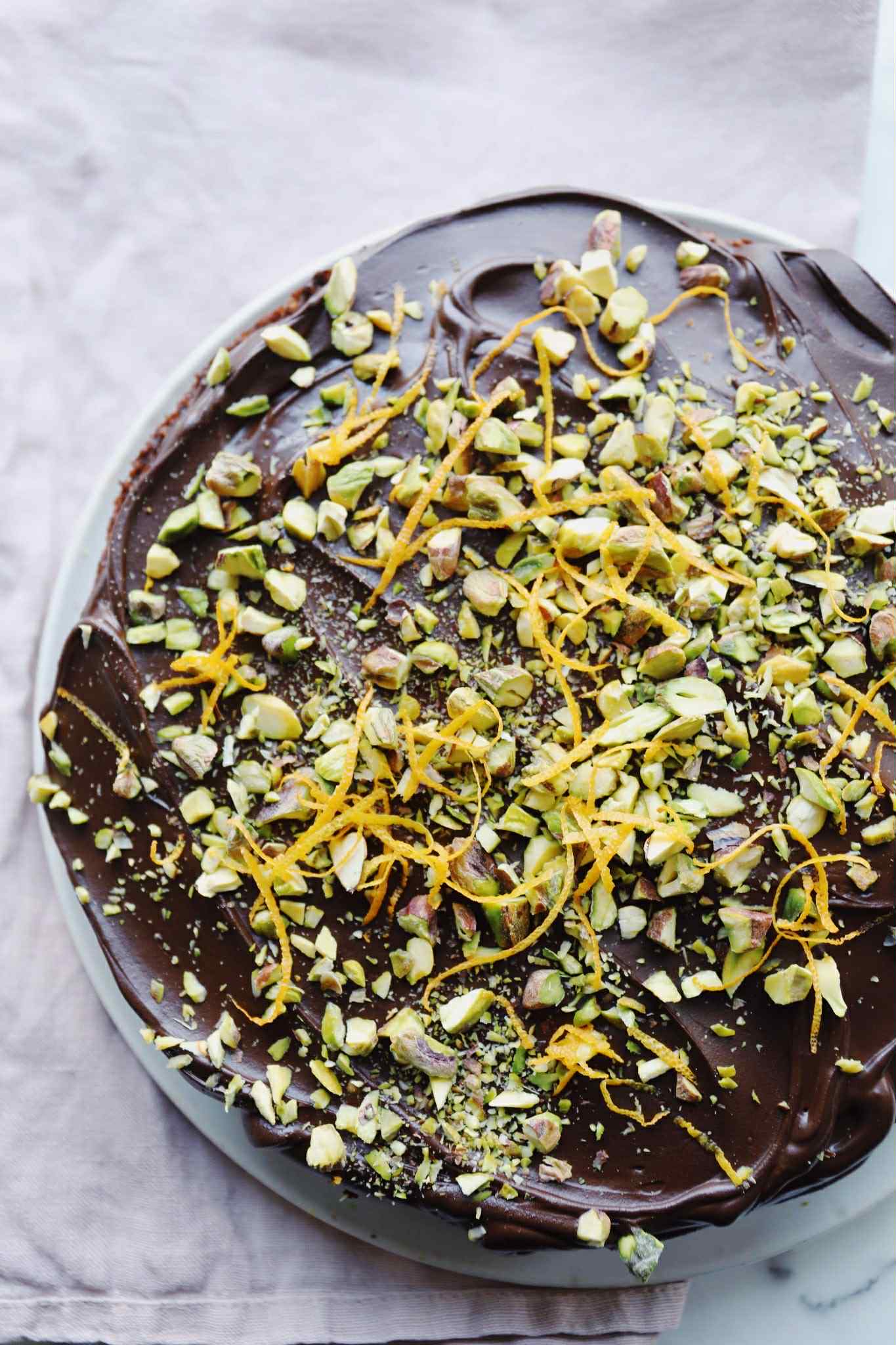 Smelt chokolade og smør i en skål over vandbad. Rør det sammen til en ensartet masse. Smør ud på den kolde kage og drys med hakkede pistacienødder og revet appelsinskal. Stil kagen på køl indtil servering. Velbekomme!