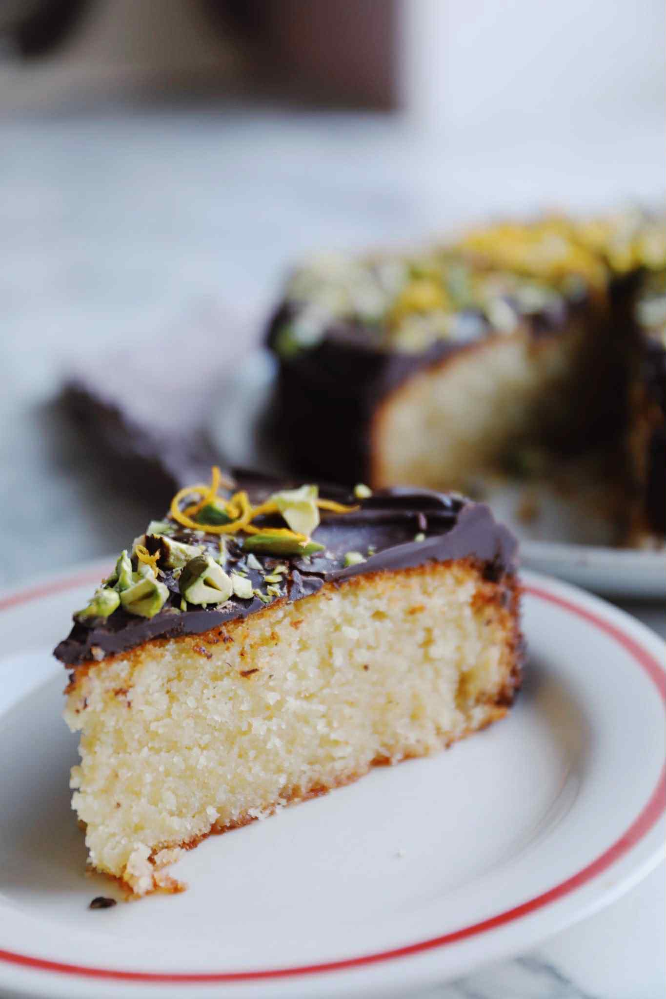 Glutenfri appelsinkage – Opskrift på svampet og saftig glutenfri appelsinkage med marcipan, mørk chokolade og pistacienødder. Denne glutenfri kage er så lækker og meget nem at bage. Kagen er lavet ud fra min meget populære opskrift på glutenfri citronmåne. I stedet for citronskal og citronsaft, så har jeg selvfølgelig brugt appelsinskal og appelsinsaft. Når kagen er bagt og afkølet, så pyntes den med et lag mørk chokolade, smeltet sammen med smør, og så drysses der hakkede pistacienødder og revet appelsinskal udover.