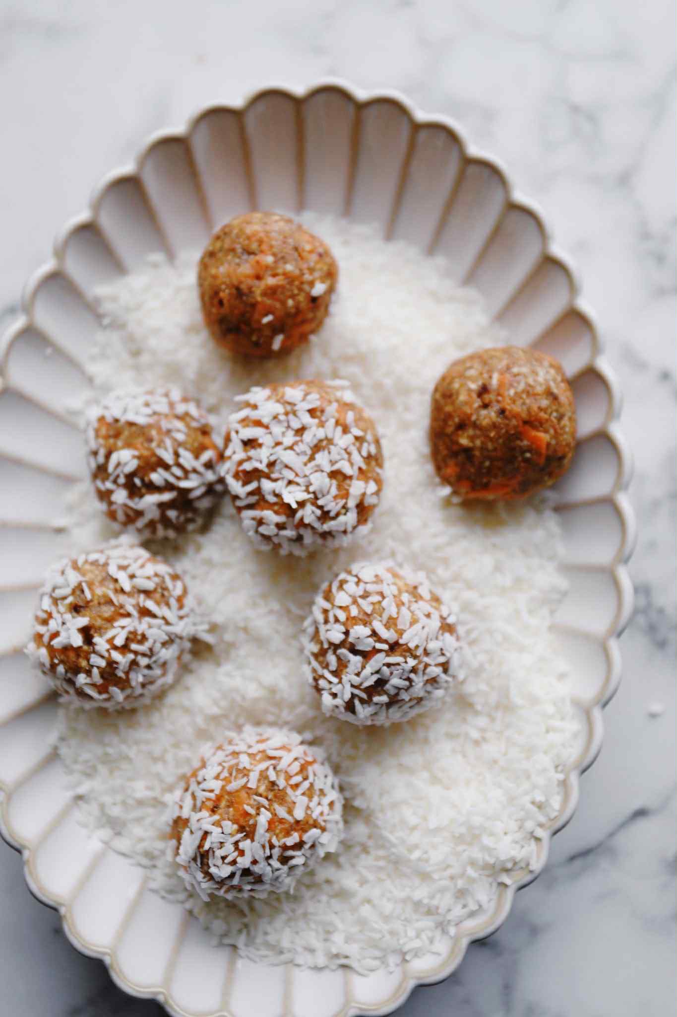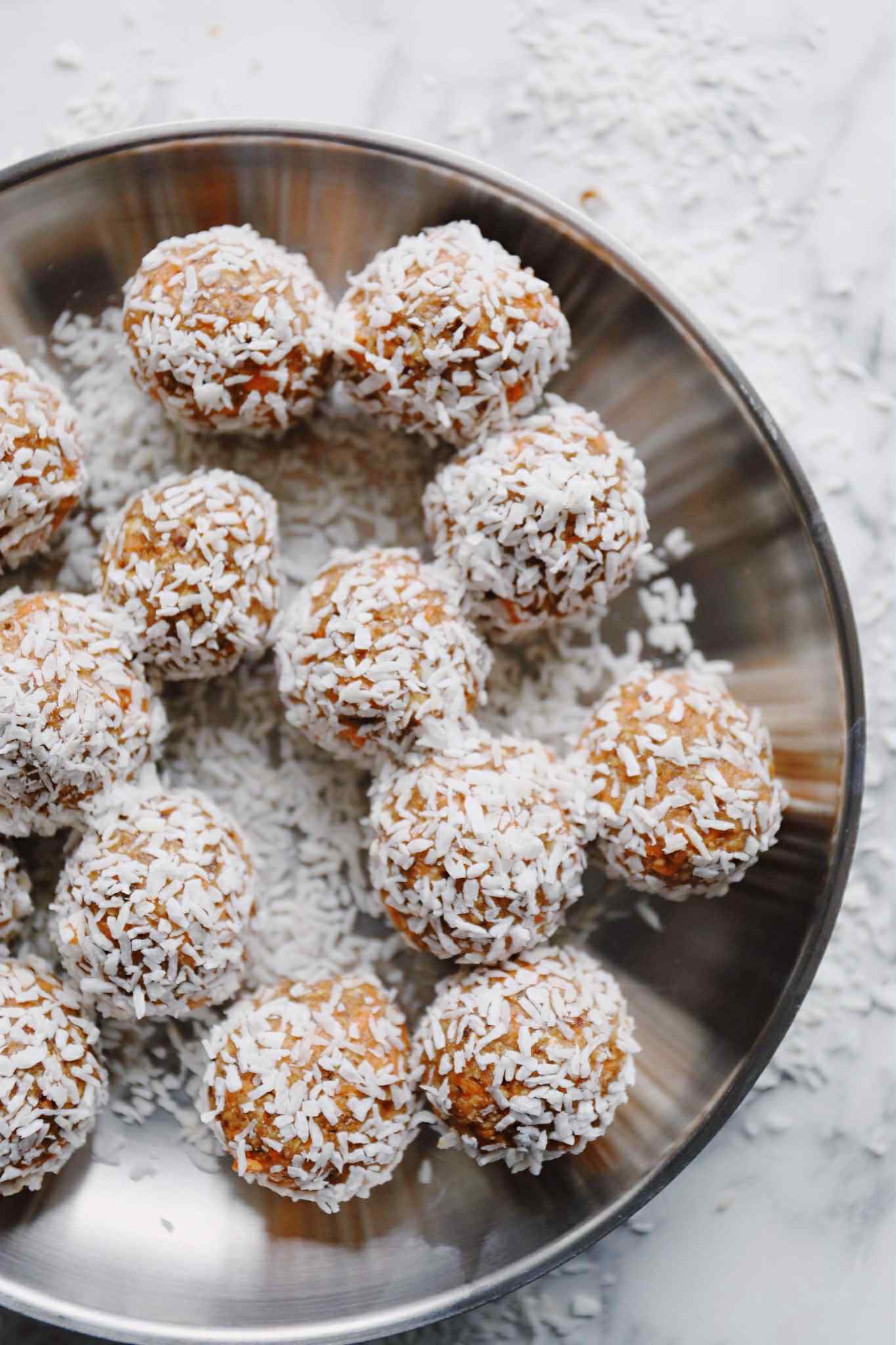 Gulerodskugler – Opskrift på de lækreste dadelkugler med smag af gulerodskage. Disse gulerodskagekugler er super lækre og smager så godt. Gulerodskuglerne består af mandler, havregryn, dadler, krydderier og revet gulerod. Det hele køres i en foodprocessor til en samlet og ensartet masse, som formes til kugler, der trilles i kokosmel. De smager næsten som en gulerodskage med de varme krydderier og de revne gulerødder.