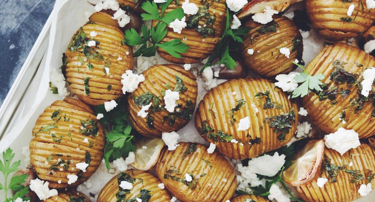 Hasselback kartofler med persille, citron, hvidløg og feta