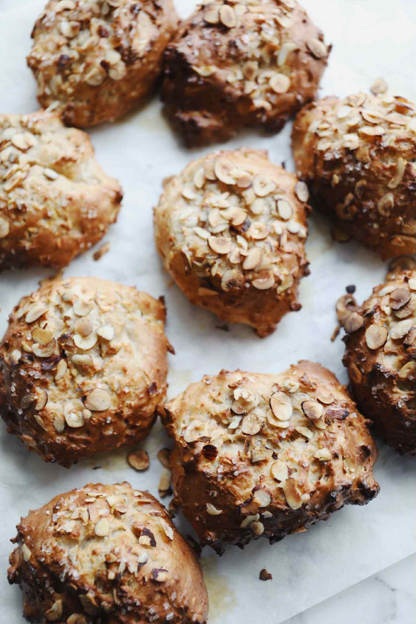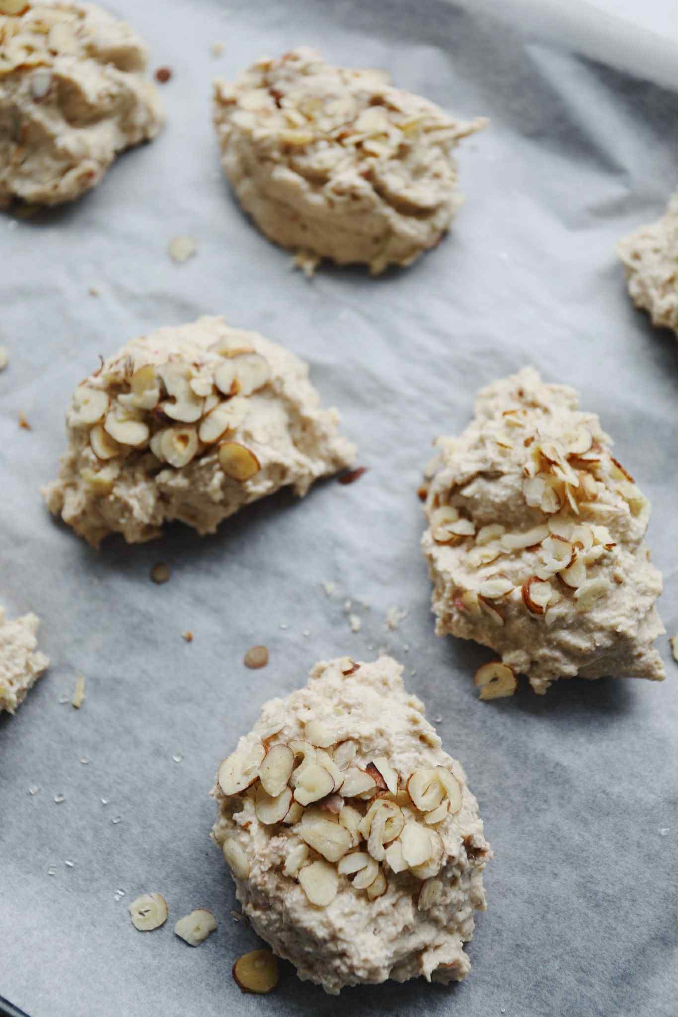 Beklæd en bageplade med bagepapir og sæt 8-10 boller af dejen på bagepapiret med to våde skeer. Drys med perlesukker og hasselnøddeflager.