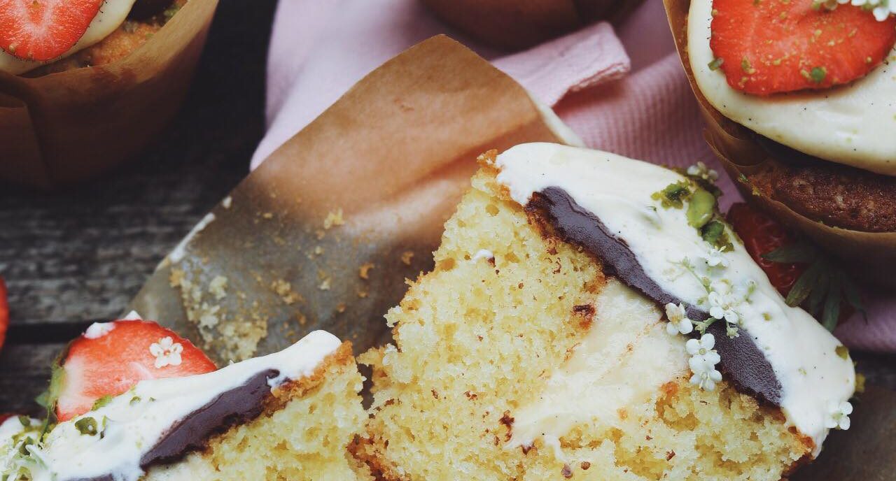 Jordbærtærte muffins! Jordbærtærte er nok en af mine aller aller yndlings kager, og især når den bliver pyntet med friske og søde danske jordbær. Jeg har her tryllet jordbærtærte om til muffins og de smager SÅ skønt! En svampet marcipanmuffin med kagecreme i midten, mørk chokoladeganache lag, kagecreme (igen) og pyntet med jordbær, hakkede pistacienødder og hyldeblomster. Kagerne kan sagtens laves glutenfrie, byt blot hvedemel ud med mandelmel. Kagecremen kan med fordel koges et par dage i forvejen. Rigtig god fornøjelse!