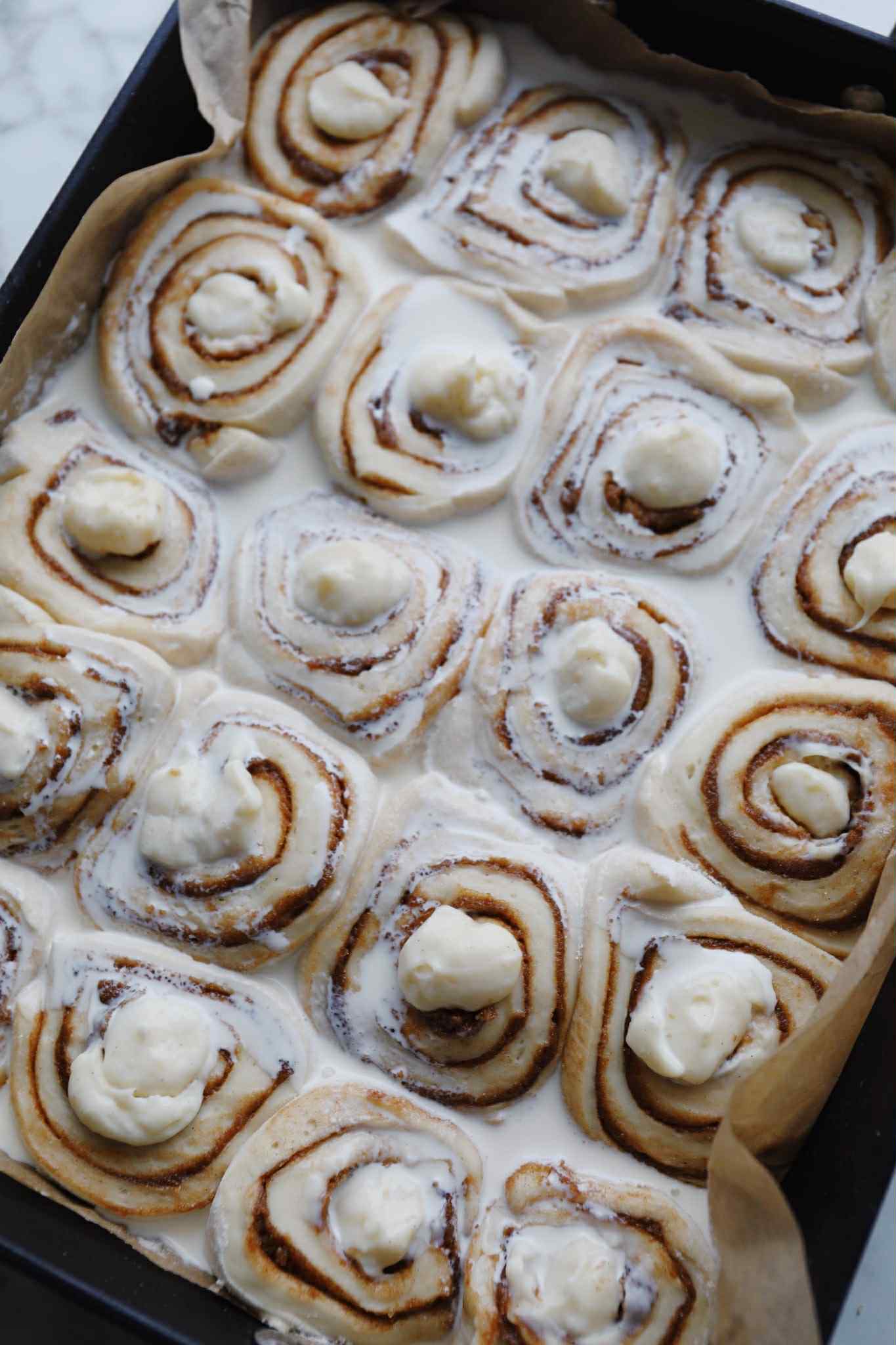 Det særlige ved disse snegle er, at de, inden de bliver bagt, overhældes med piskefløde, som gør sneglene endnu mere snaskede og saftige, og de får den bedste konsistens. Vaniljecremen kan med fordel laves dagen inden. Jeg har en anden opskrift på kanelsnegle med creme i midten, de er bare lidt mere klassiske og pyntet med glasur i stedet for ganache. De færdigbagte kanelsnegle kan sagtens fryses ned.