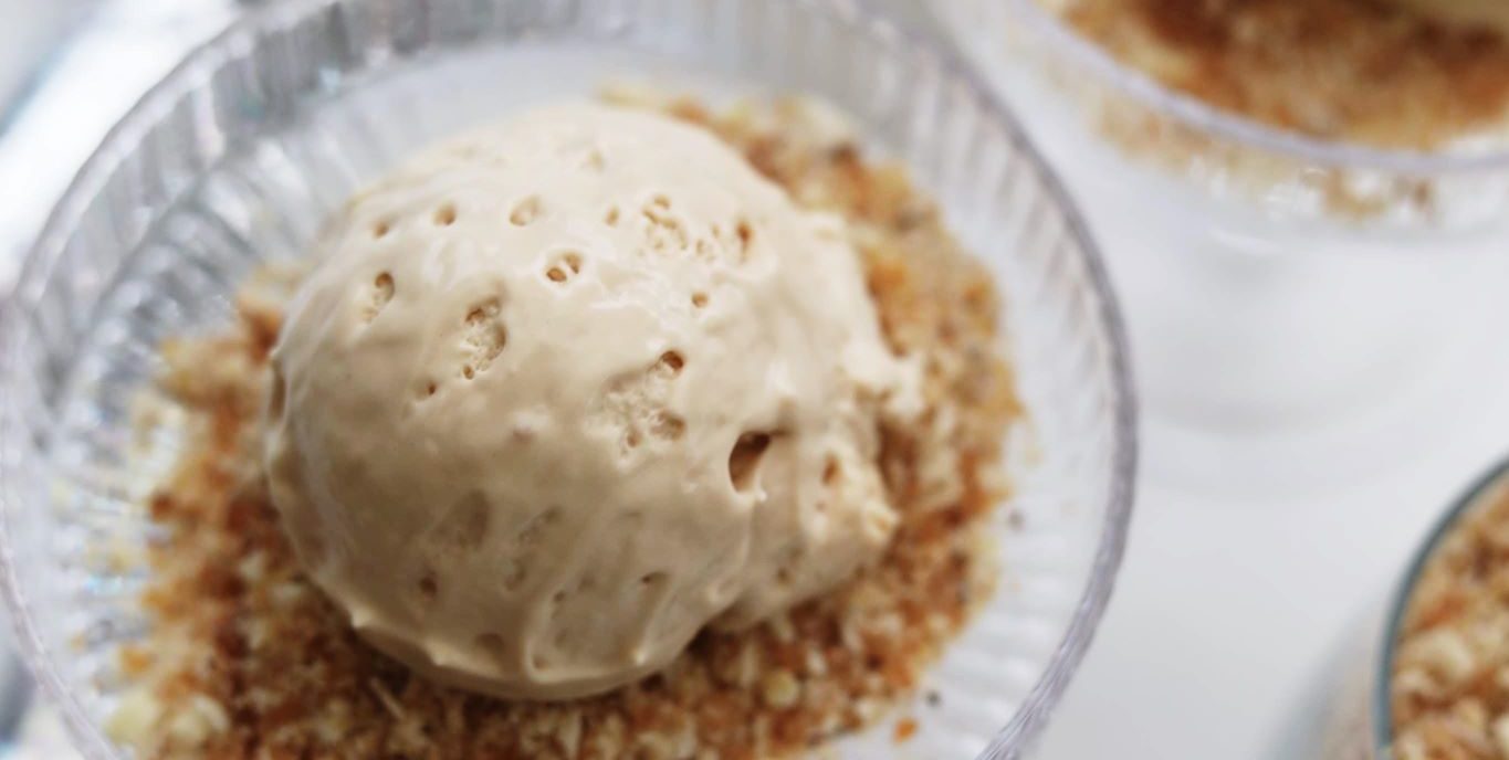 Tag isen ud af fryseren min 30 minutter inden servering. Fordel nøddekronaten i skåle eller portionsglas, som jeg har brugt, og placer en kugle karamelis ovenpå. Velbekomme!