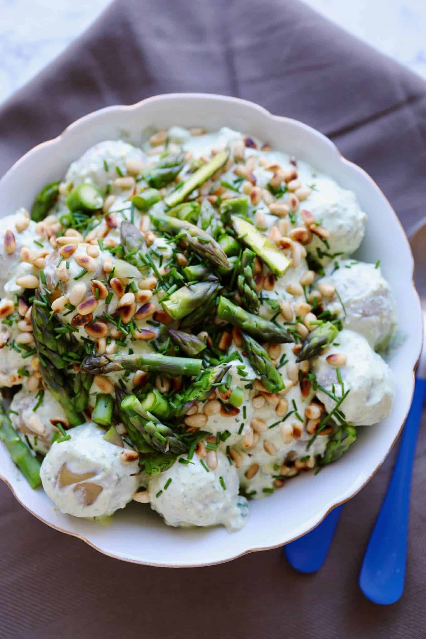 Kartoffelsalat med ramsløg – Her får du opskriften på en lækker og cremet kold kartoffelsalat med ramsløgsdressing, asparges, pinjekerner og purløg. Denne kartoffelsalat med ramsløgspesto smager så skønt og er en rigtig dejlig forårsret. Kartoffelsalaten består af små kogte kartofler med skræl, som vendes sammen med en dressing bestående af ramsløgspesto, creme fraiche, hvidvinseddike, sukker, salt og peber. Der vendes også små skiver af friske asparges, som lige hurtigt er blevet blancheret. Kartoffelsalaten pyntes med aspargestoppene, ristede pinjekerner og purløg.
