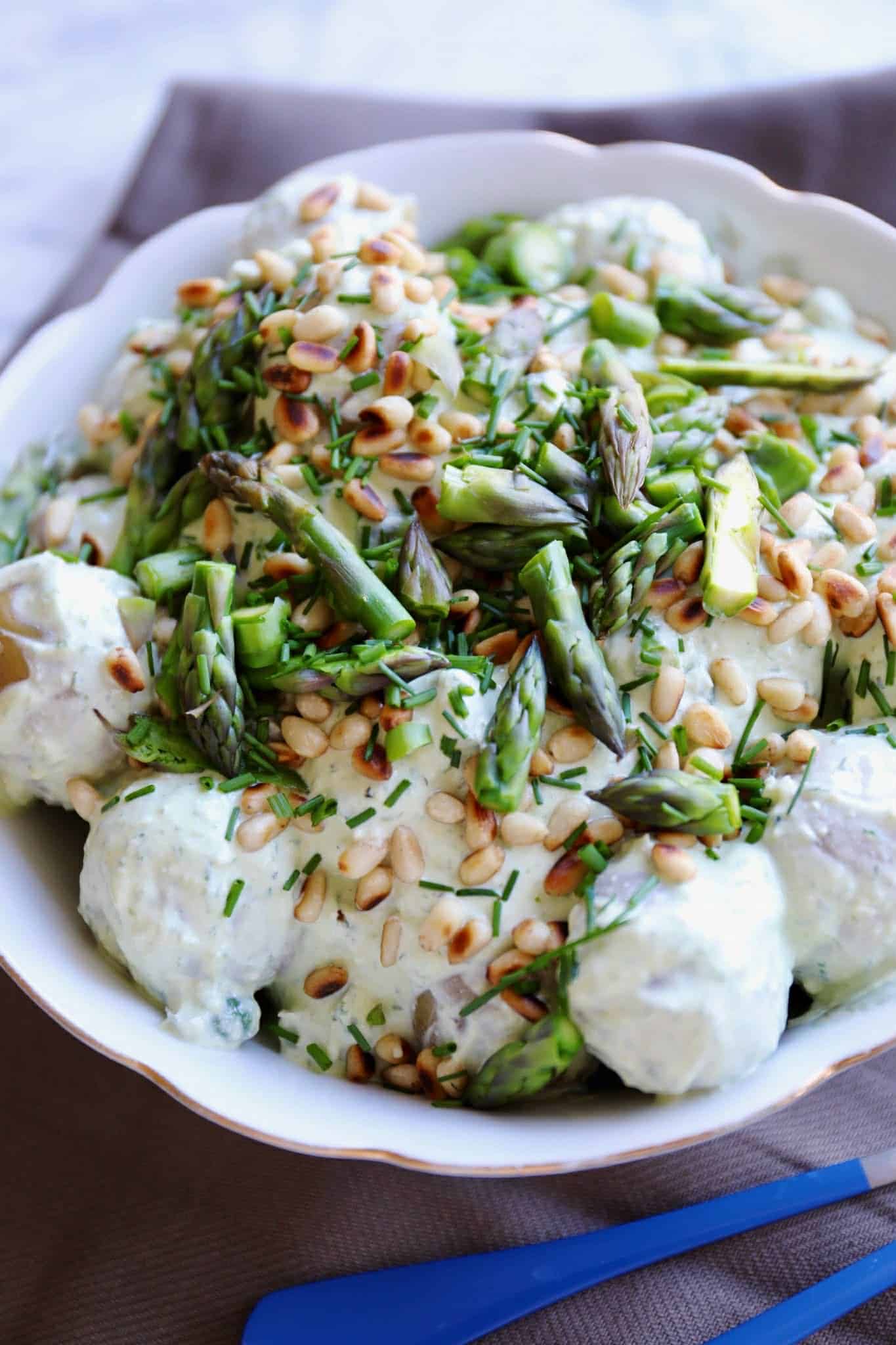 Knæk enden af asparges. Blancher asparges i kogende vand i 1-2 min. Skær asparges i tynde skiver (gem toppene til pynt). Vend aspargesskiver og kartofler i ramsløgsdressingen. Kom kartoffelsalaten i en skål og pynt med ristede pinjekerner, aspargestoppe og purløg. Server straks eller stil kartoffelsalaten på køl i et par timer inden servering. Velbekomme!