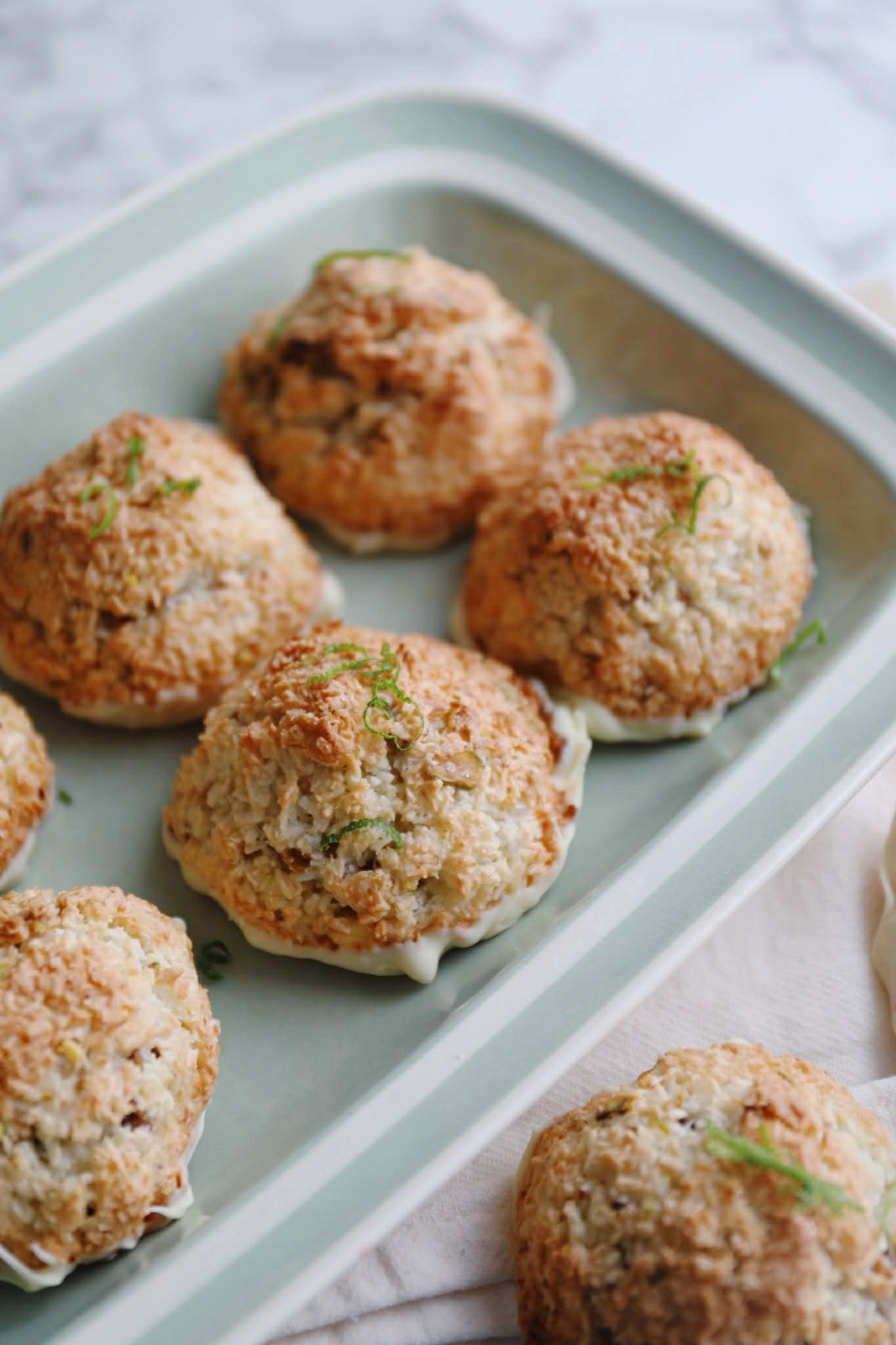 Kokosmakroner med pistacie og lime – Her får du opskriften på de lækreste, sprøde og seje kokosmakroner med pistacie, lime og hvid chokolade. Disse kokosmakroner er lavet ud fra min mors opskrift på klassiske kokosmakroner, hvor der så her også er tilsat hakkede pistacienødder og limeskal i kokosmassen. Alle ingredienserne røres sammen i en skål, hvorefter massen stilles på køkkenbordet og hviler, sådan så sukkeret opløses, og massen bliver dejlig klistret. Herefter laves der toppe af kokosmassen på en bageplade med bagepapir, og kokosmakronerne bages til de er gyldne og sprøde. Når kokosmakronerne er afkølet, så kan de pensles med smeltet hvid chokolade i bunden, som giver sådan en skøn smag. Kokosmakronerne bliver dejligt sprøde udenpå og seje/bløde indeni.
