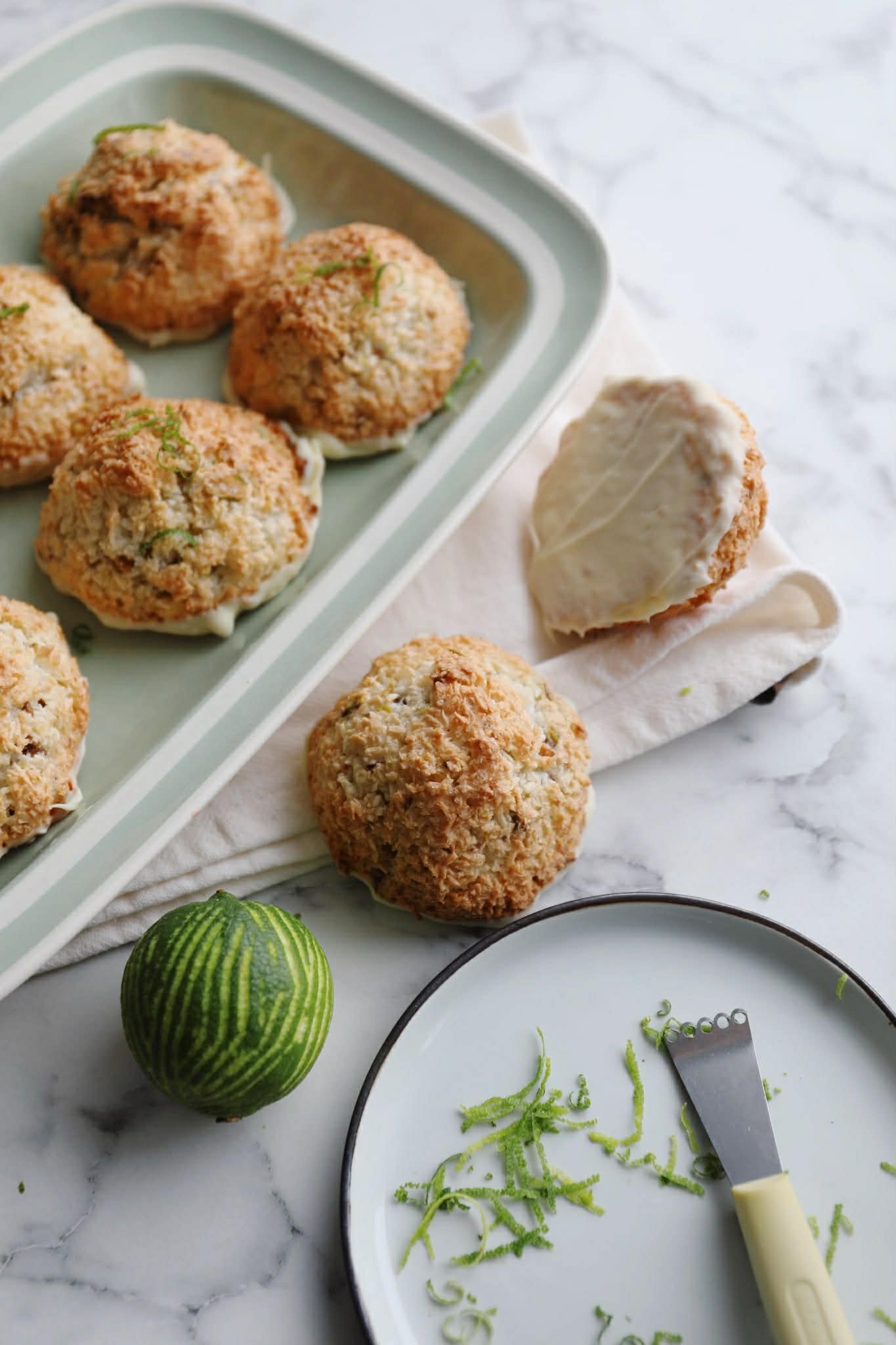 Kokosmakroner er altid et kæmpe hit, når min mor har bagt sådan en portion til forskellige lejligheder. Da kokosmakronerne kun består af få ingredienser, så er det meget nemt at lave dobbeltportion, hvis man skal bage til mange mennesker. De kan sagtens bages dagen inden servering og opbevares i kagedåser. Disse kokosmakroner med pistacie og lime er perfekte at servere til f.eks. påskefrokosten. Prøv også min opskrift på napoleonshatte. Rigtig god fornøjelse!