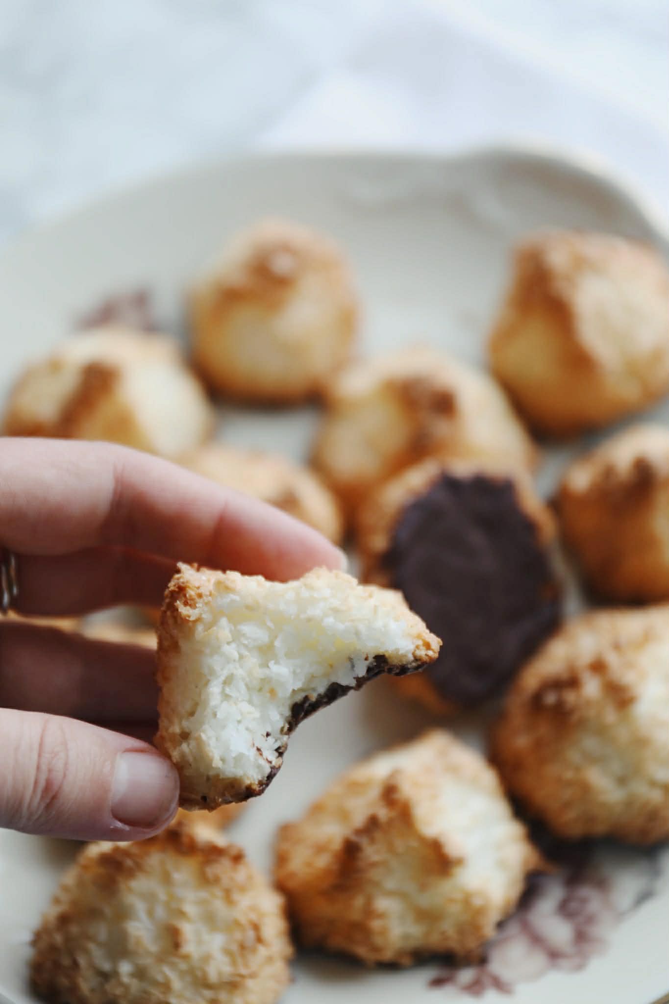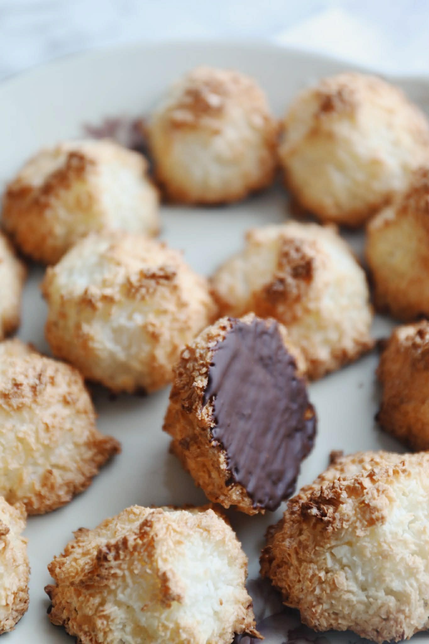 Kokosmakroner – Opskrift på de bedste klassiske kokosmakroner eller kokostoppe, som er sprøde udenpå og bløde indeni. Kokosmakroner er en klassisk småkage, som er så nem at bage. Disse kokosmakroner er lavet efter min mors opskrift og det er de bedste kokosmakroner. Kokosmakronerne består kun af 3 ingredienser: Kokosmel, æggehvider og sukker. De 3 ingredienser røres sammen i en skål, hvorefter massen stilles på køkkenbordet og hviler, sådan så sukkeret opløses, og massen bliver dejlig klistret. Herefter laves der små toppe af kokosmassen på en bageplade med bagepapir, og kokosmakronerne bages til de er gyldne og sprøde. Når kokosmakronerne er afkølet, så kan de pensles med smeltet mørk chokolade i bunden. Kokosmakronerne bliver sprøde udenpå og seje/bløde indeni.