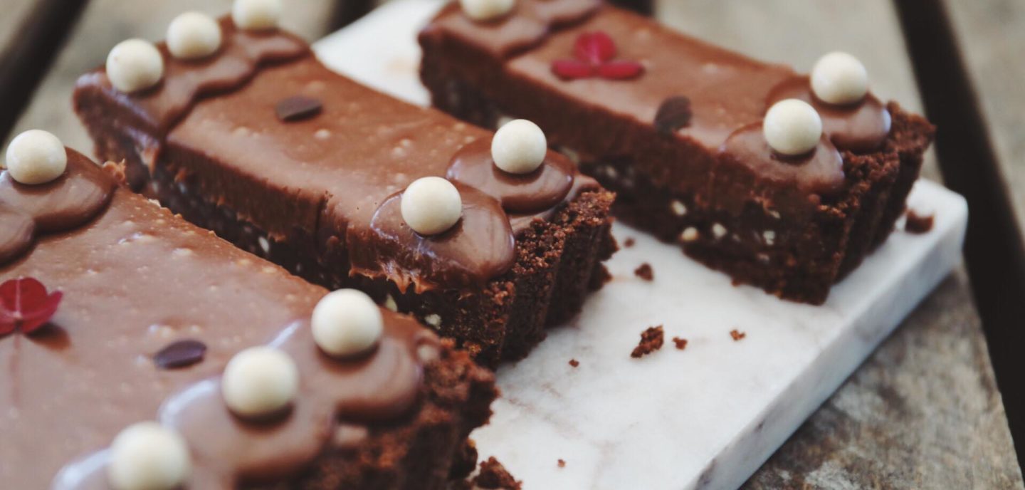 Denne konfekttærte er altså et kæmpe hit blandt chokoladeelskere. Den har 4 elementer: sprød kikse-kakaobund, knasende mandelpraliné, blød mælkechokoladeganache og sidt en uimodståelig chokoladekaramel. Den kan med fordel laves nogle dage i forvejen, det bliver den kun bedre af. Her kommer opskriften: